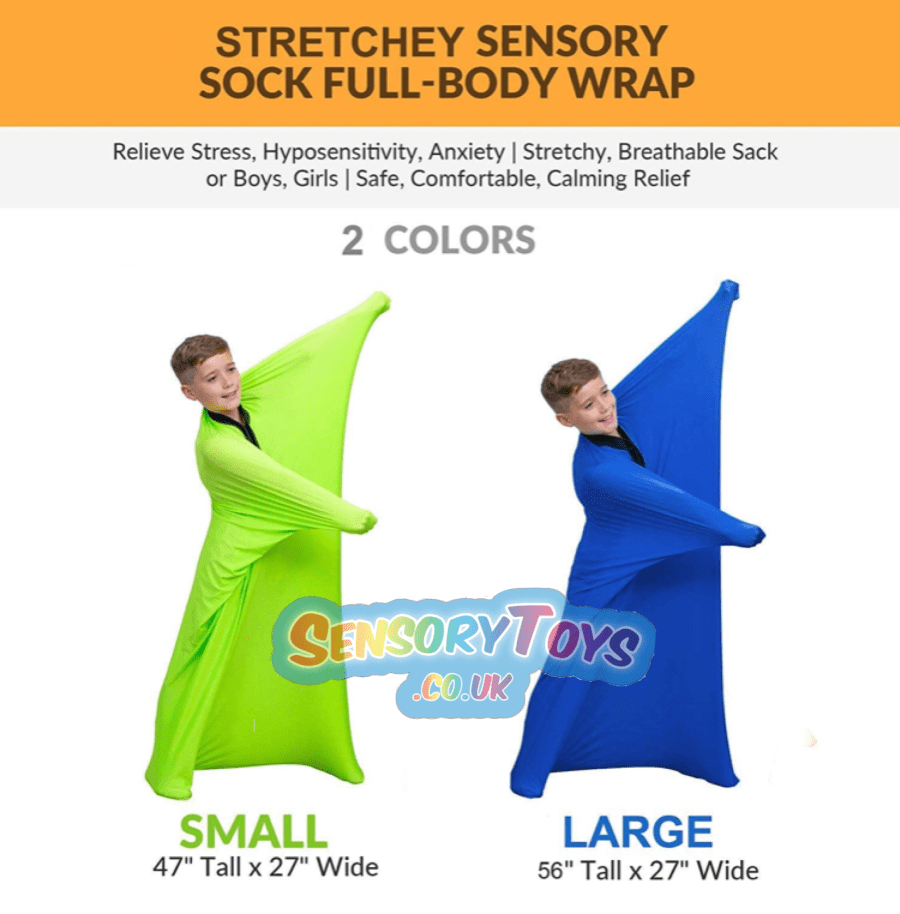 This sensory body sock is an all round movement, tactile and deep pressure experience. With a velcro fastening once inside, the stretchy material gently resists your movements encouraging experimentation of moves. The resistant walls of the body sock improves spatial awareness through balance and resistance. The sensory body sock is an essential part of any sensory routine to reinforce awareness and encourage creative movement. The body sock is a great therapy and play tool for autism and sensory integration.