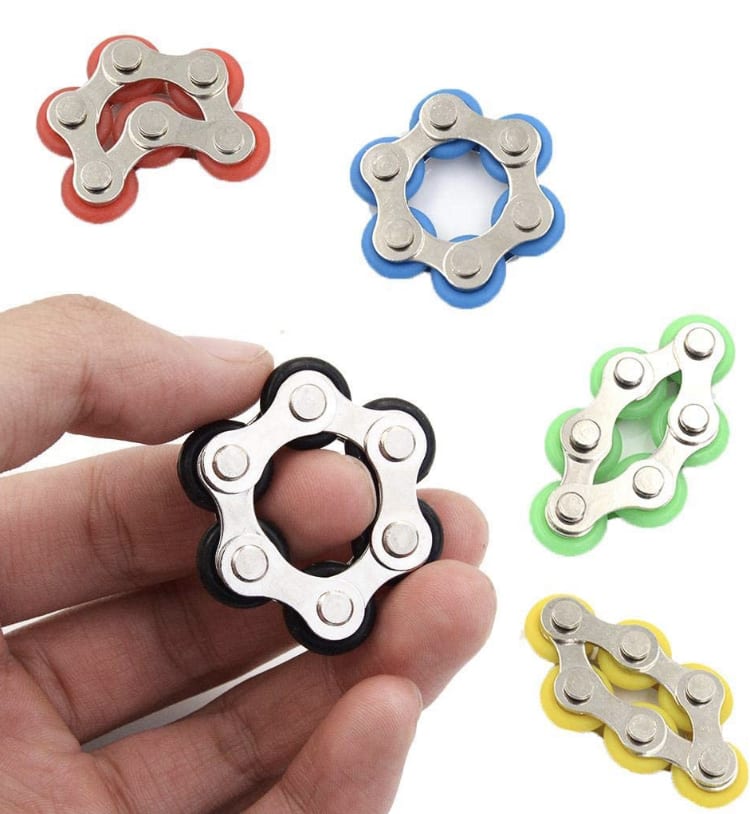 The Mini Bike Chain Fidget is a great fidget and stress toy for both adults and children to help relieve stress and anxiety, assist with focus, and build finger dexterity and fine motor skills. This fidget toy comprises a looped chain of 6 interlinked steel bike chain links with soft tactile coloured silicone rings on each join. The relaxing twirling motion is similar to spinning a ring around the end of your finger but better.