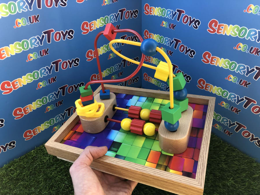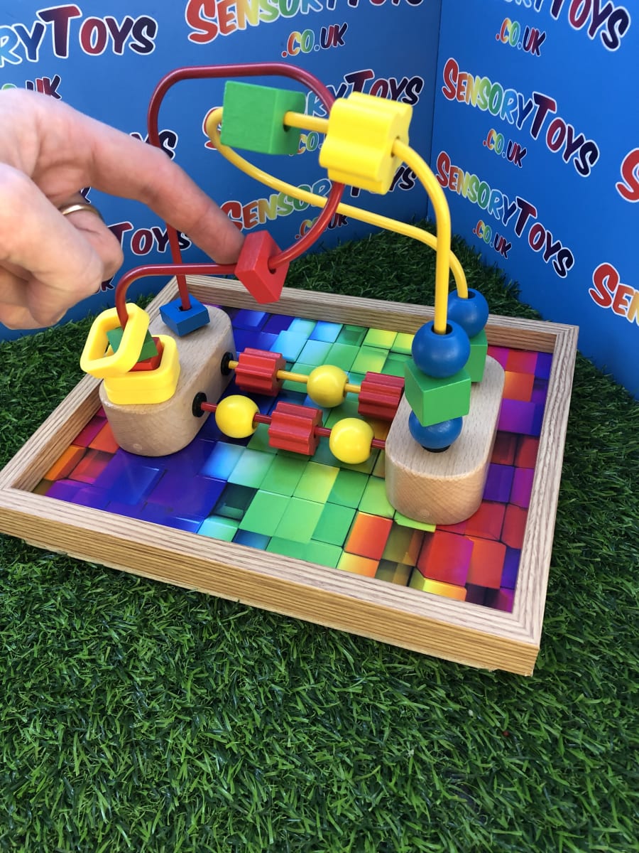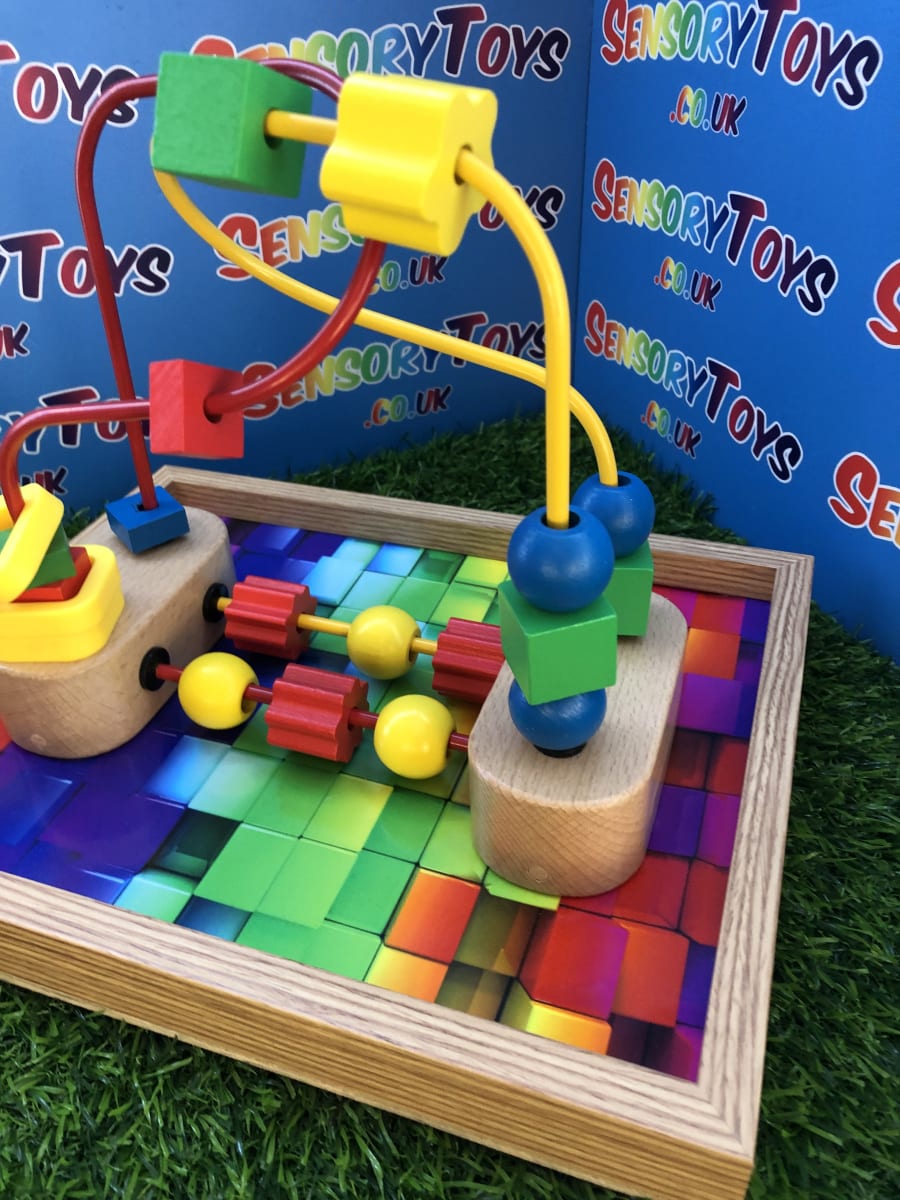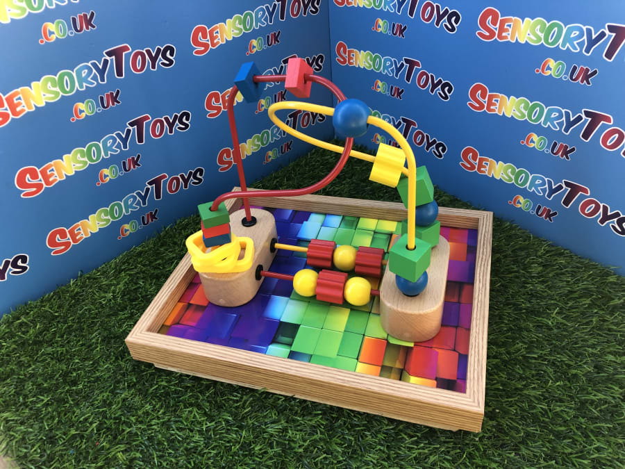 A custom handmade wooden activity maze that secures to a table! A beautiful wooden border with a classic 3d multicoloured base, the Beads can be pushed around the metal wire to the opposite destination. The beads at the bottom can be spun and pushed too. A durable, sustainable material sensory toy learning time that’s built to stand the test of time. This is a one of three custom designed learning toy.