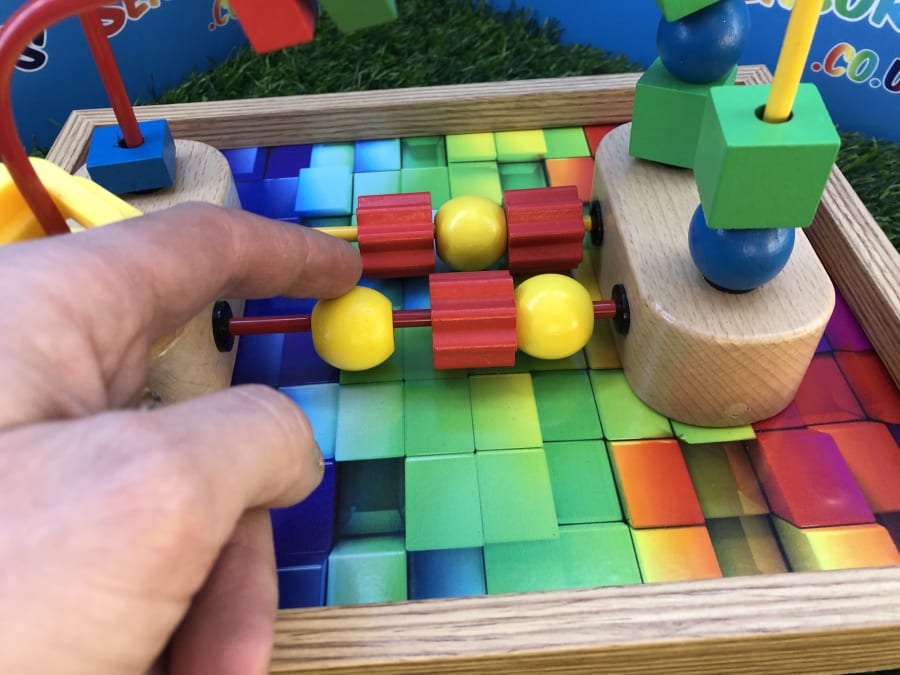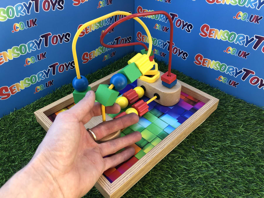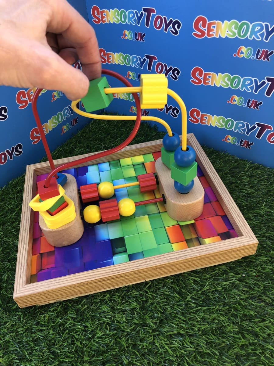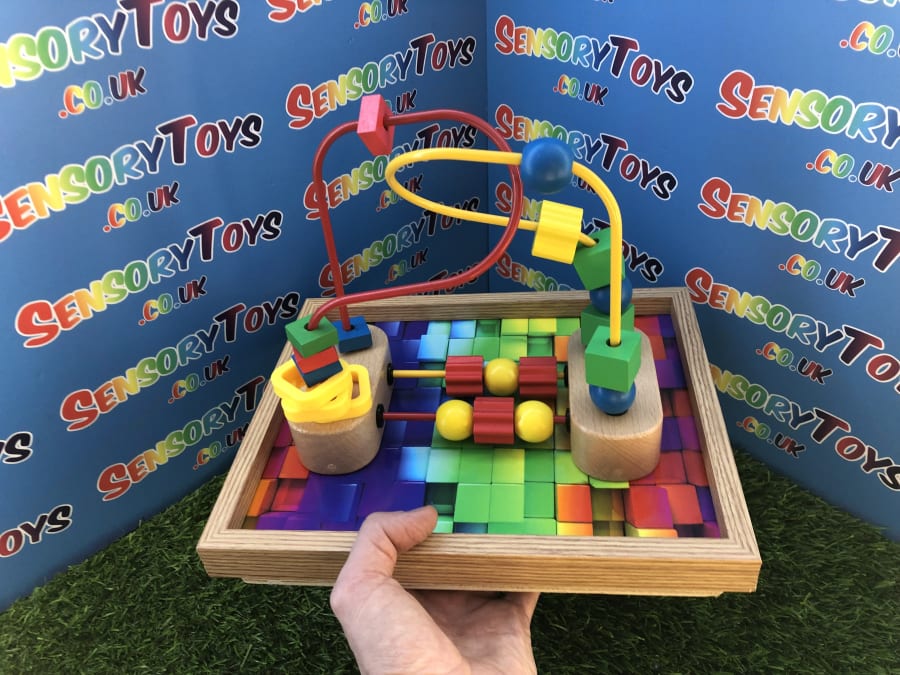 A custom handmade wooden activity maze that secures to a table! A beautiful wooden border with a classic 3d multicoloured base, the Beads can be pushed around the metal wire to the opposite destination. The beads at the bottom can be spun and pushed too. A durable, sustainable material sensory toy learning time that’s built to stand the test of time. This is a one of three custom designed learning toy.