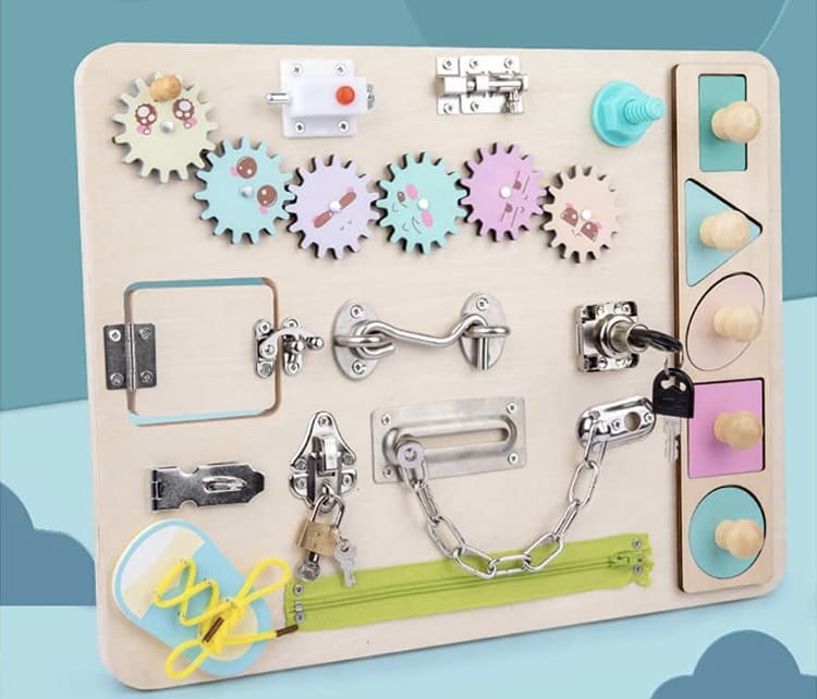 A handmade bush board with eleven different fiddle activities. Suitable for little wandering hands that enjoy problem solving tasks. A learning based sensory play game guarantee to provide hours of entertainment. A classic wooden Montessori toy that’s durable and a firm favourite development toy.