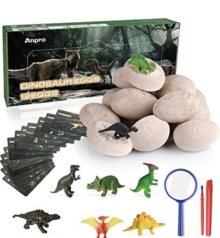 Experience real excitement with these dinosaur egg fossils in which you can discover what it feels like to excavate dinosaur eggs and identify the dinosaurs inside with an excavation guide, just like a real paleontologist! Each dinosaur egg has a individual colorful box wrapped. It all comes packaged in a neat box. Includes everything needed for the young scientist to excavate the dinos, and gain a deeper understanding of them. Simply dig it up or soak the egg in water to soften it for a few minutes, and then carefully chisel away the clay to excavate the dinosaurs inside. Once your dinosaur is excavated,simply rinse off remaining clay and identify dinosaurs with learning guide.