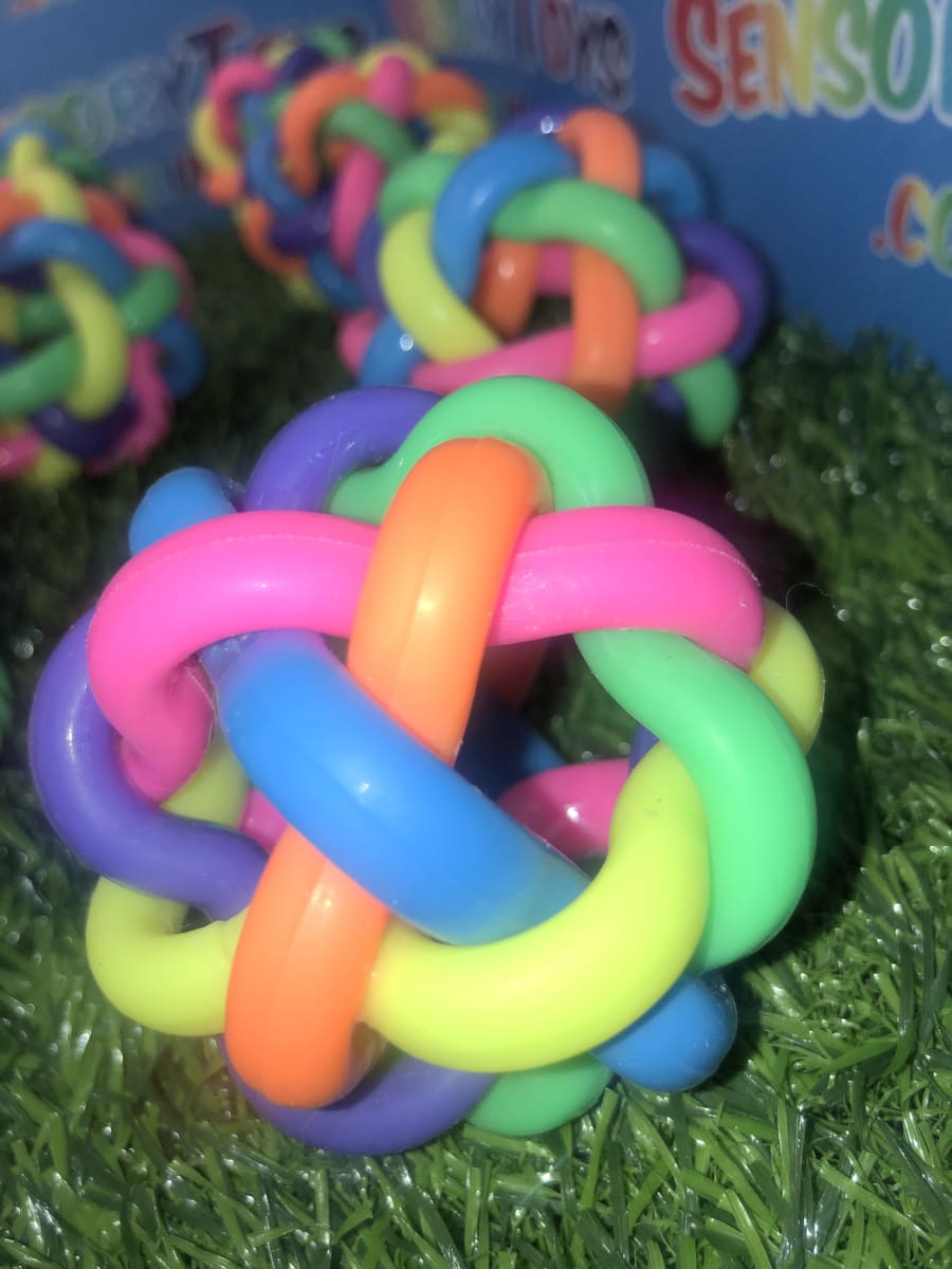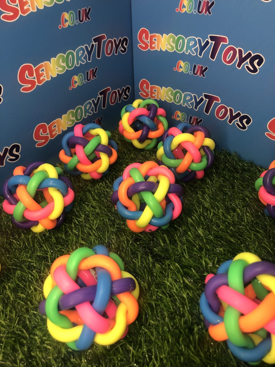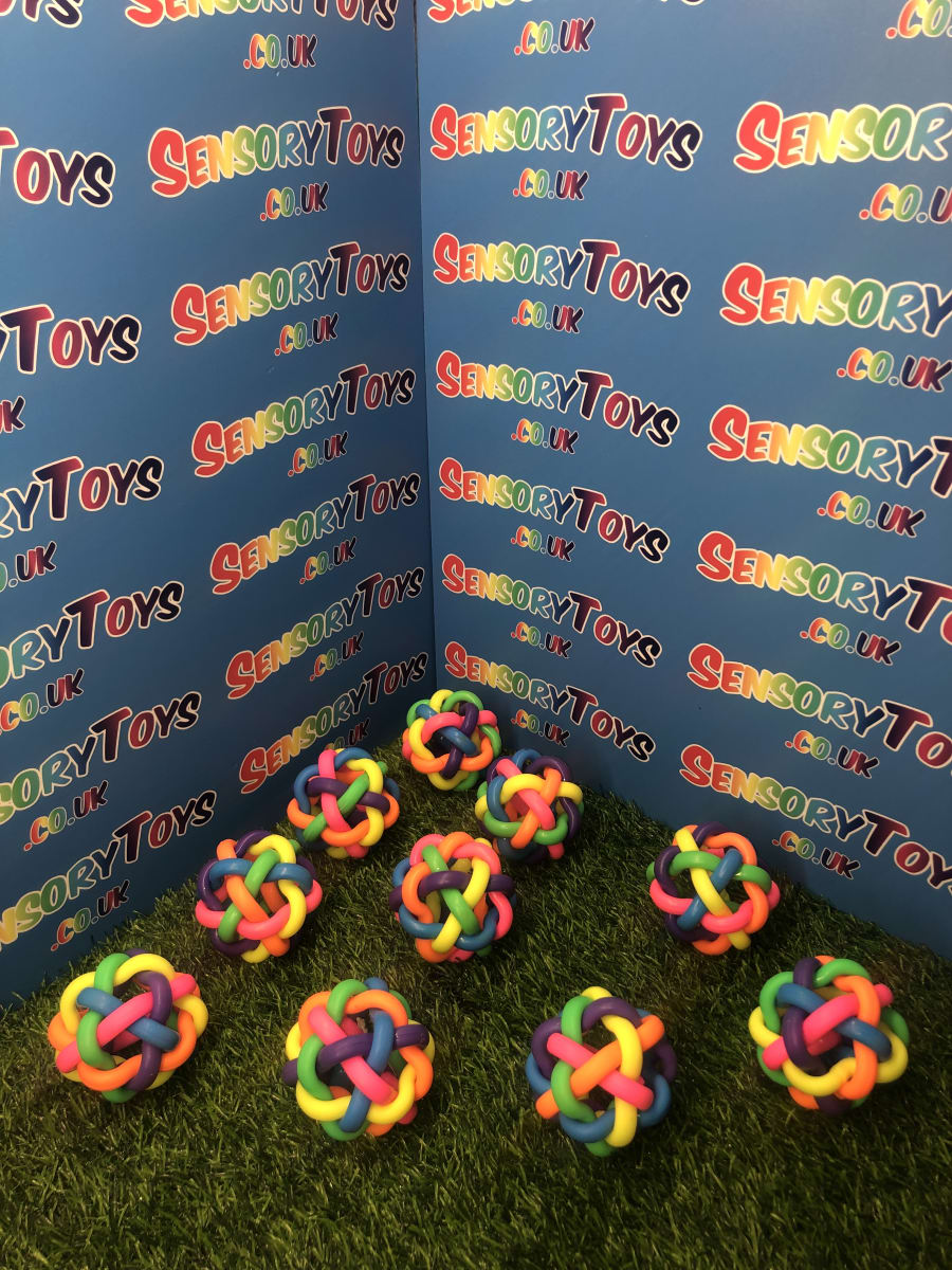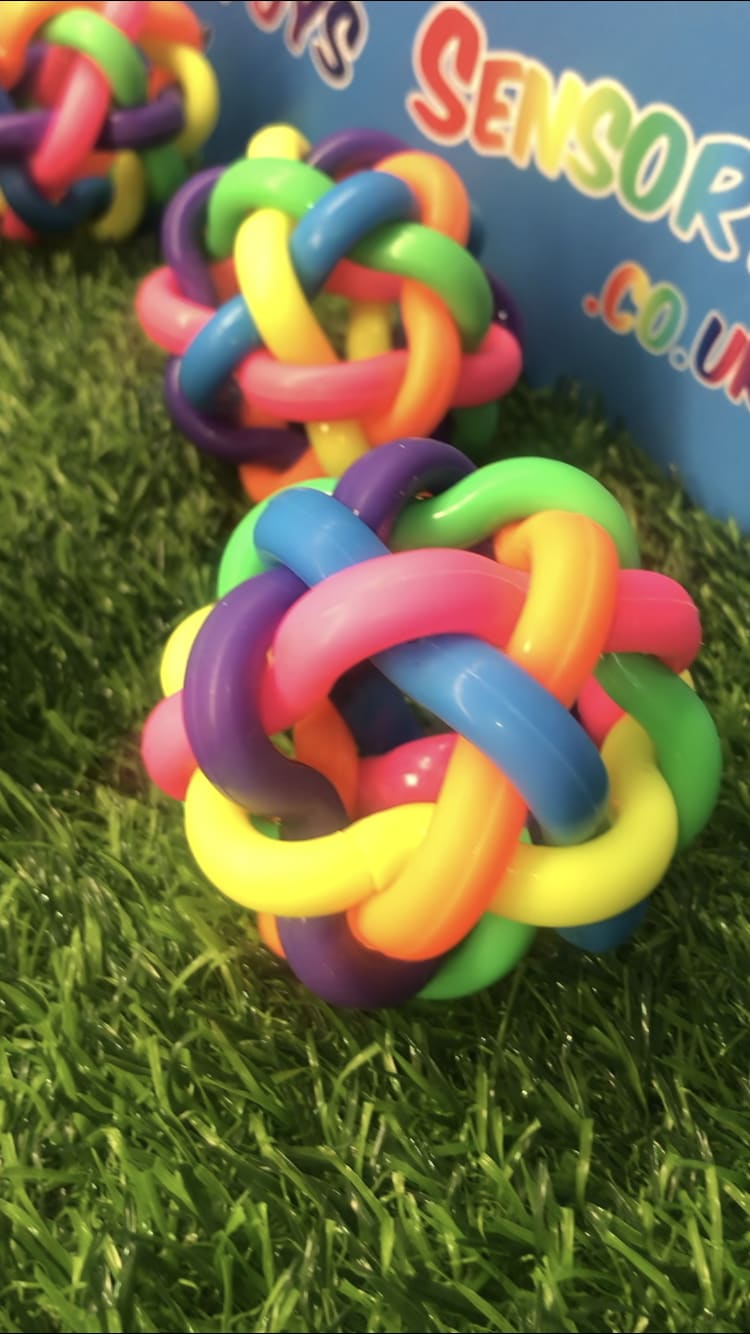 Our rainbow tangle bouncy ball is constructed from six tightly interlinked rubber shapes knotted together into a multi-coloured ball. Due to the soft nature of the rubber material, not only can they be bounced and chased, they can also be squeezed - helping with stress relief and anxiety. They are the perfect toy for all children, especially those with additional needs.