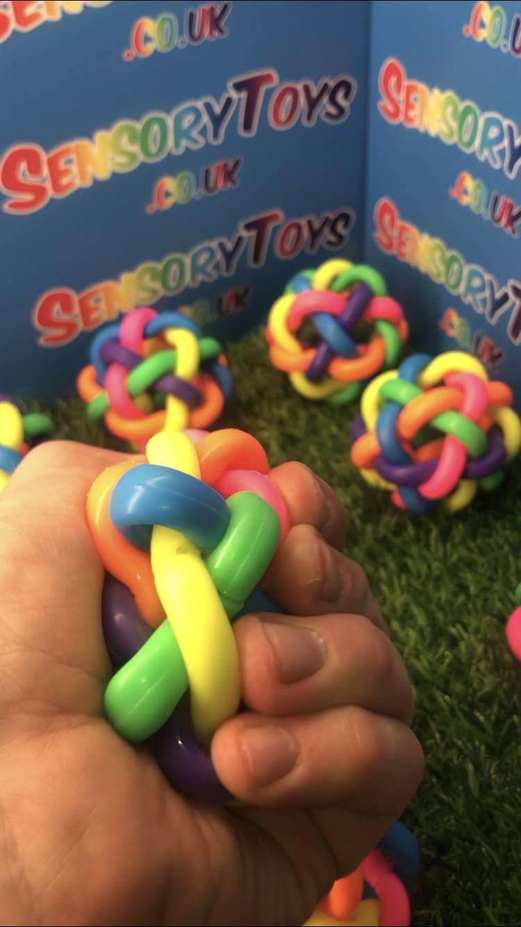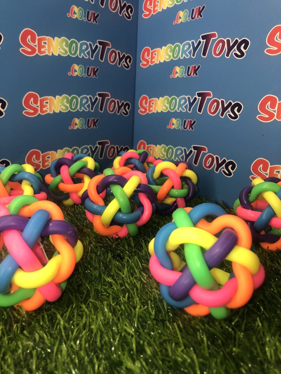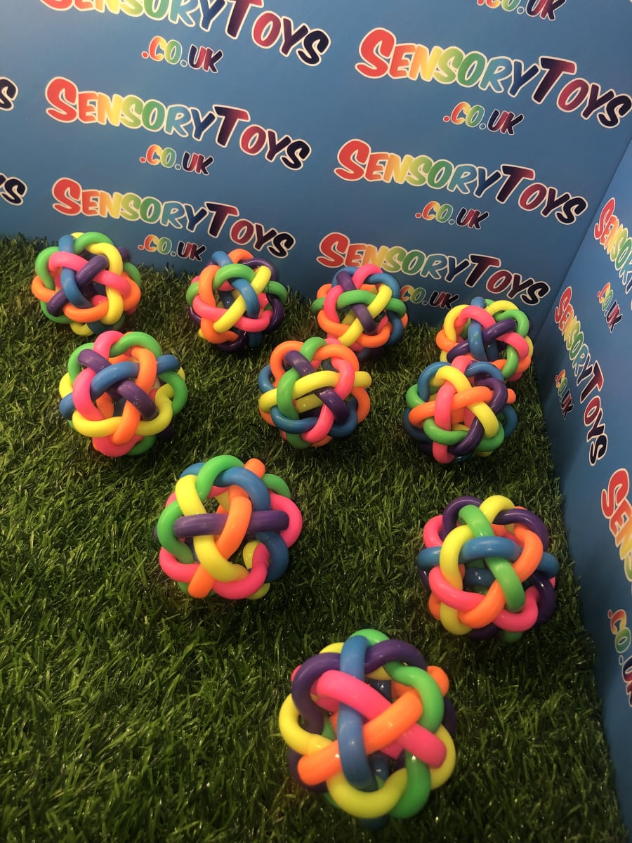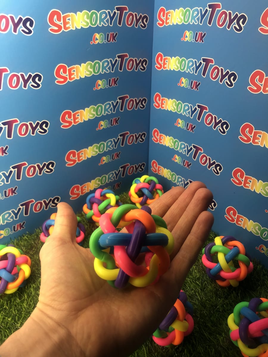 Our rainbow tangle bouncy ball is constructed from six tightly interlinked rubber shapes knotted together into a multi-coloured ball. Due to the soft nature of the rubber material, not only can they be bounced and chased, they can also be squeezed - helping with stress relief and anxiety. They are the perfect toy for all children, especially those with additional needs.
