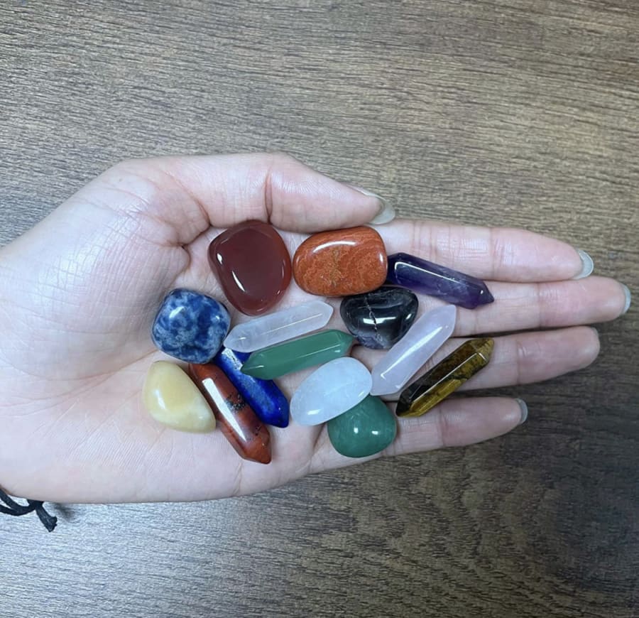 Set of fourteen beautiful healing crystals perfect for fidgeting hands. It is believed that many crystals have different healing powers and influence over good energy. The Chakra stones are a popular addition to many meditation, yoga and therapy sessions to help reduce stress and anxiety levels.