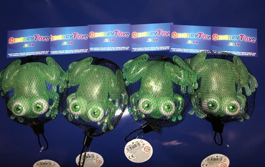 A goggle eyed squeeze frog! Watch the frogs eyes as he follows you whichever way you turn his body. A water bead type body makes your frog perfect for squeezing and sensory play. A popular favourite here at sensory toys.