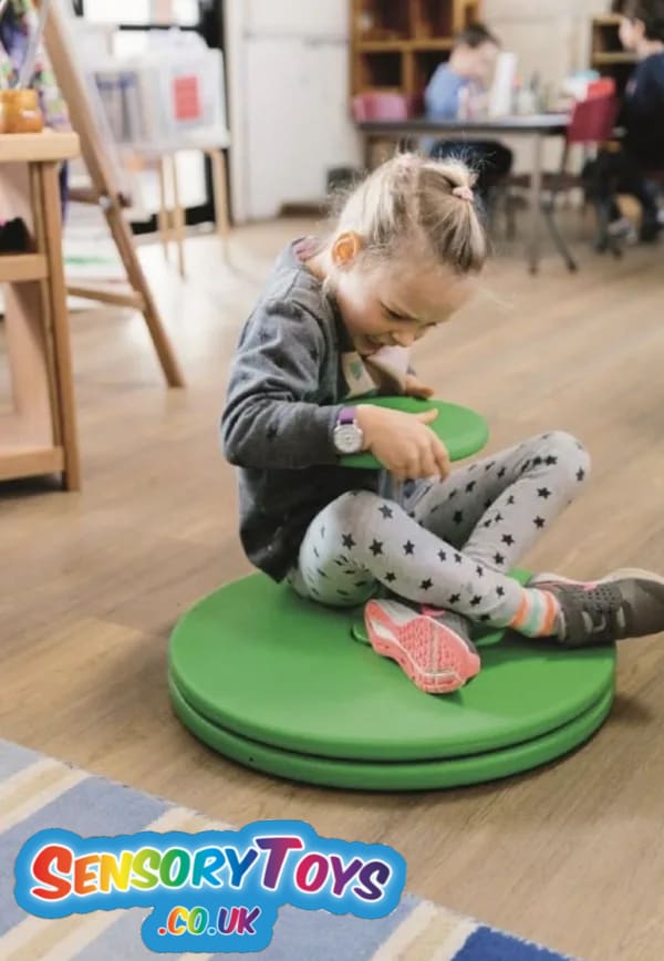 A self propelled spinning disc provides hours of repetitive fun. By learning the co-ordination of turning the disc, users can twist left or right at any pace they desire. A great free sensory product for young children’s development and any child that loves spinning and repetitive play.