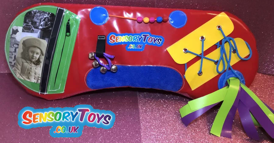Features include: •Photo/Memory pouch with zip •Sewing Fidget Beads •Music Bells •Shoe Lace Weave •Colourful Fidget Tassels •Textured Touch Pad •Fidget Zip