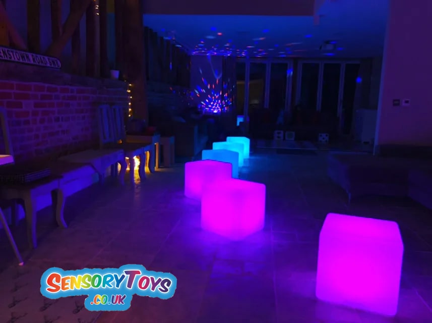 Our sensory mood lighting cubes can be changed to a variety of different colours or if they are set to fade they will gradually go through the whole spectrum, helping to create a calming atmosphere.