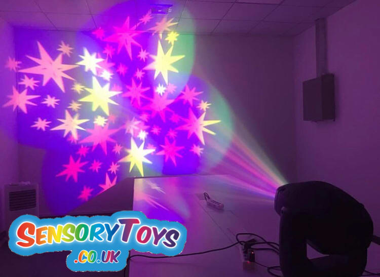 Welcome to our fantastic therapy lights! We have two sets that we offer to families within a home environment. The first is a projector style light that moves and fades stars and planets. The second is a set of three professional disco lights that can completely fill a room (Seen in our second photo)