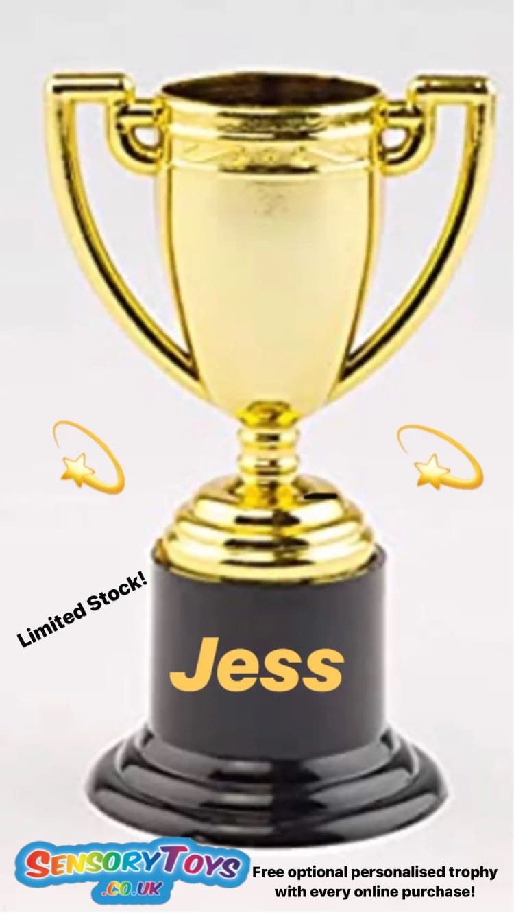 Our Personalised Achievement Trophy will be found inside every sensory box, they will personalised to your child's name. It comes in a gold colour and is a fun additional treat. Limited stock and available to add to your online order enquiry for a limited time.
