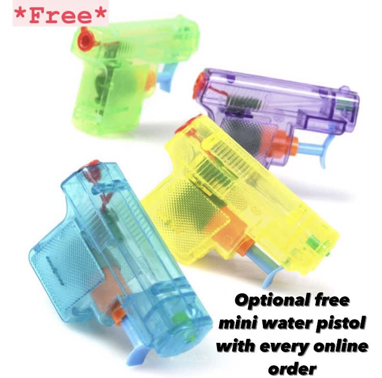 Put em up! A brilliant mini toy water pistol that shoots jets of light water. These water guns are available from us free! As a little extra way to say thank you from the team at sensory toys. We really appreciate you supporting small uk businesses and charities.