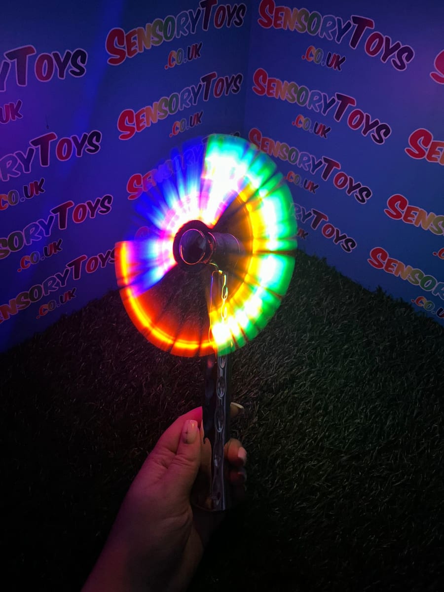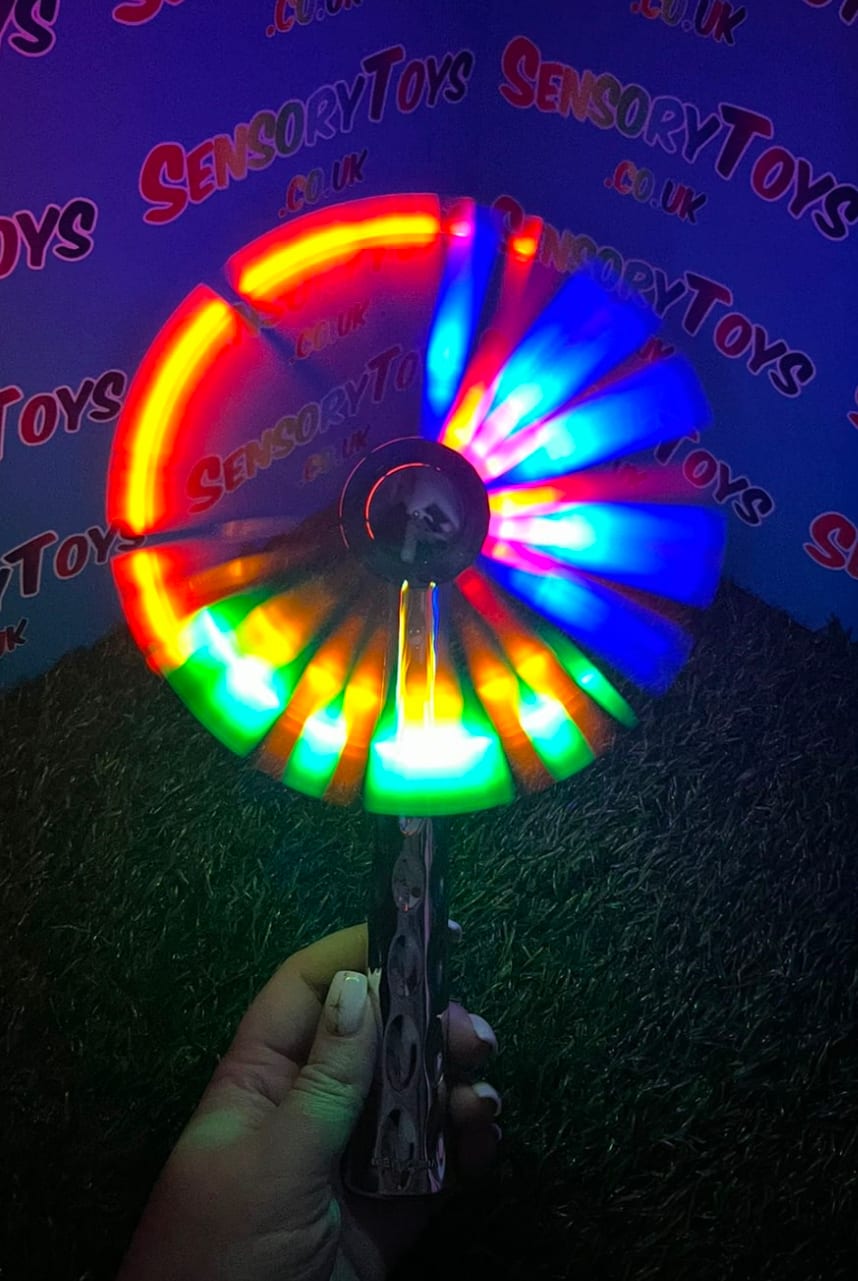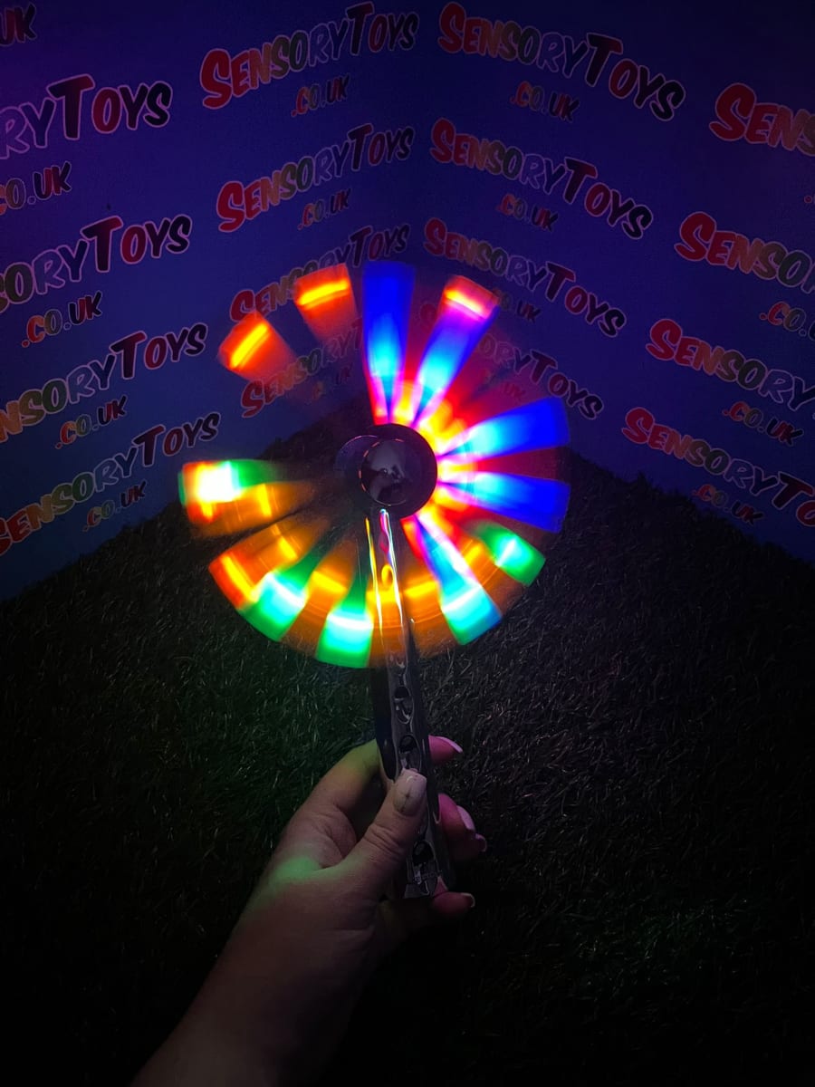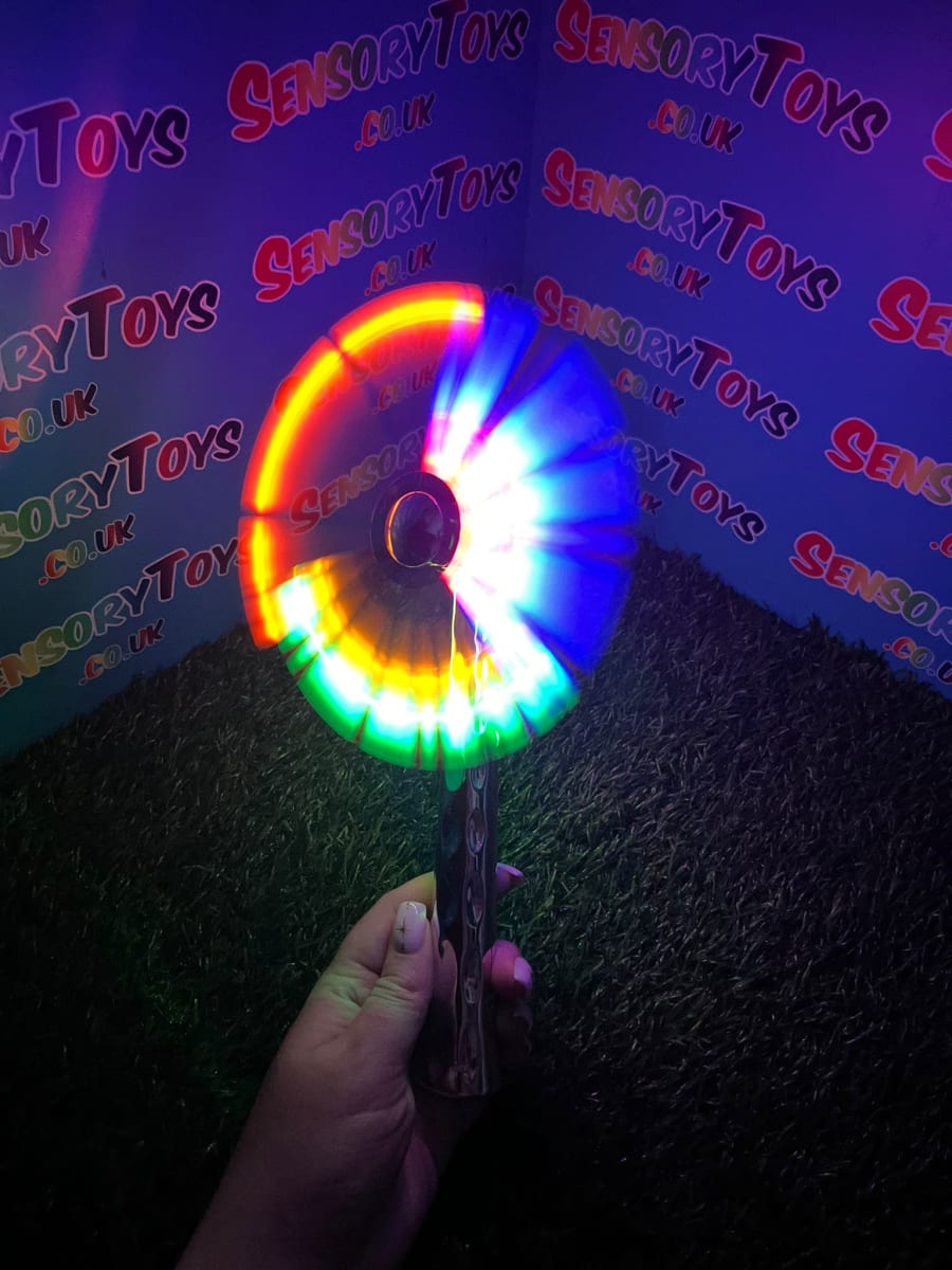 Just like winning a toy at a funfair, this classic light up spinner is a huge hit. Providing sensory stimulation from a spinning windmill motion, this product works best at night or in dark locations. One button for on and off, multiple colours magically appear with rotation. Hand held sensory toy device.