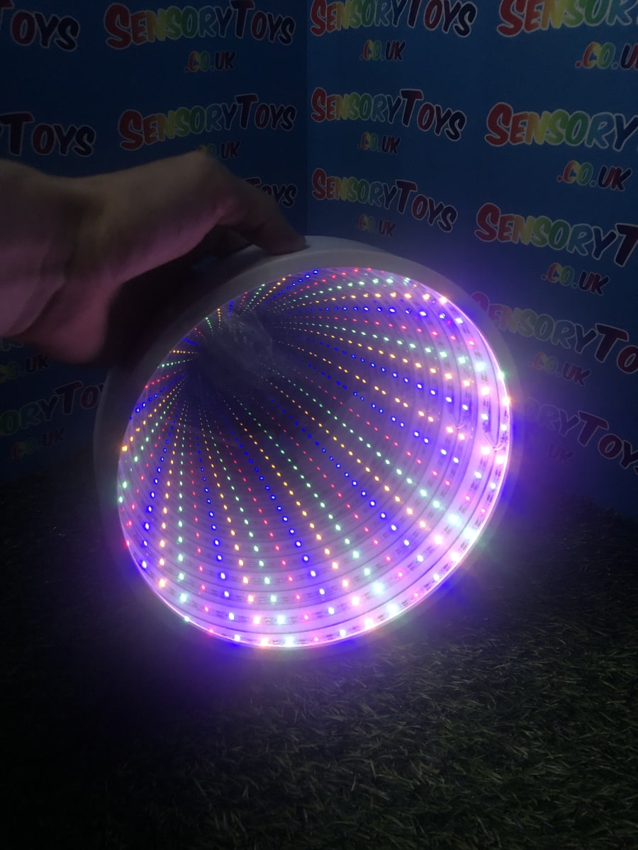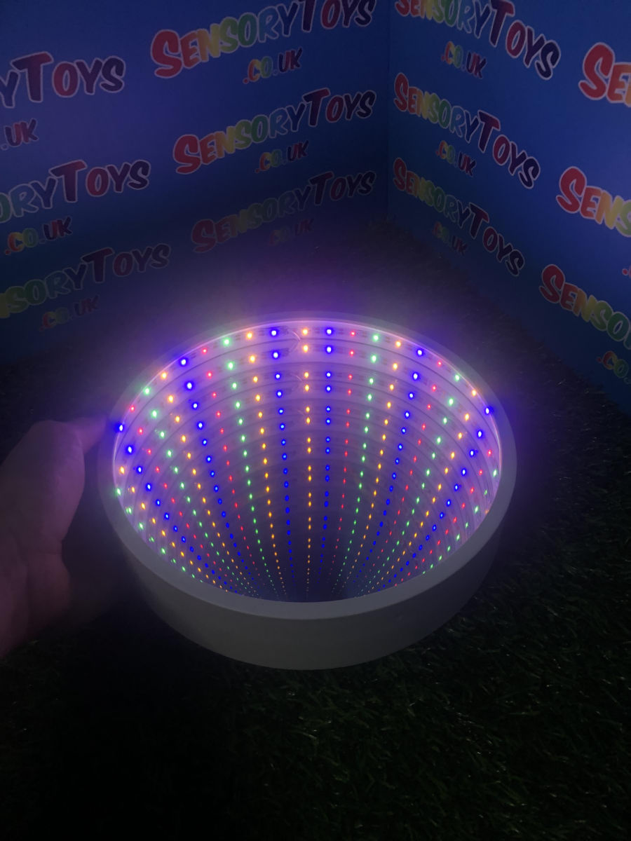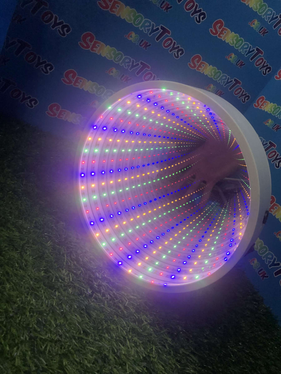 A beautiful fading visual aid that projects an illusion of an endless light tunnel. Switch on to watch the slowly fading lights change colour and provide a relaxing experience as you look into the distant lights.