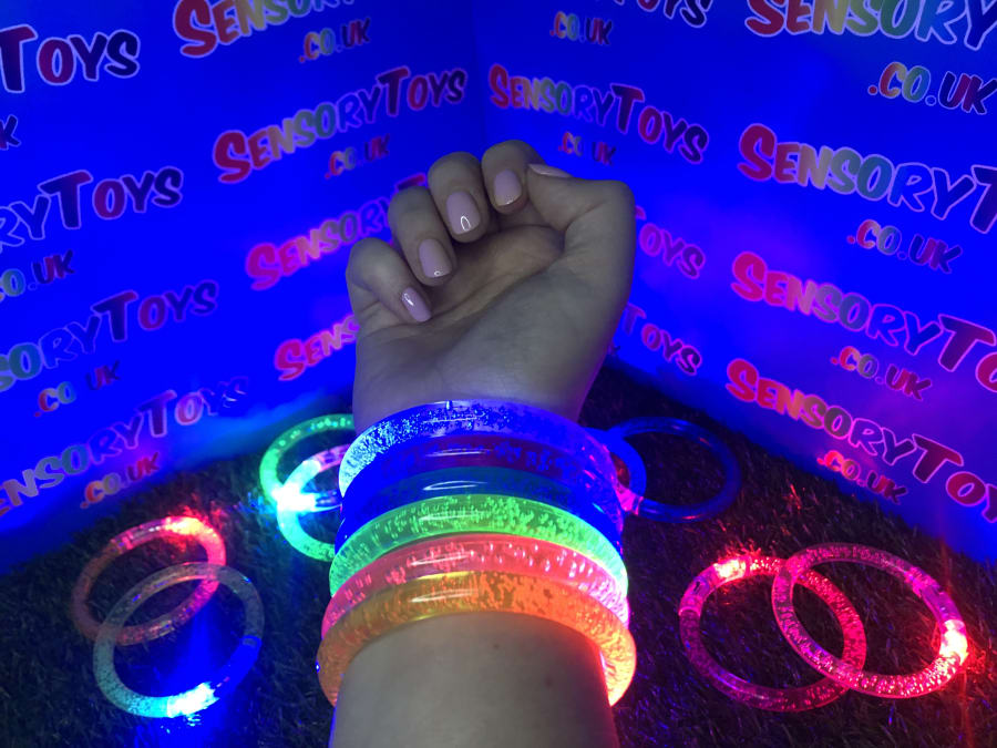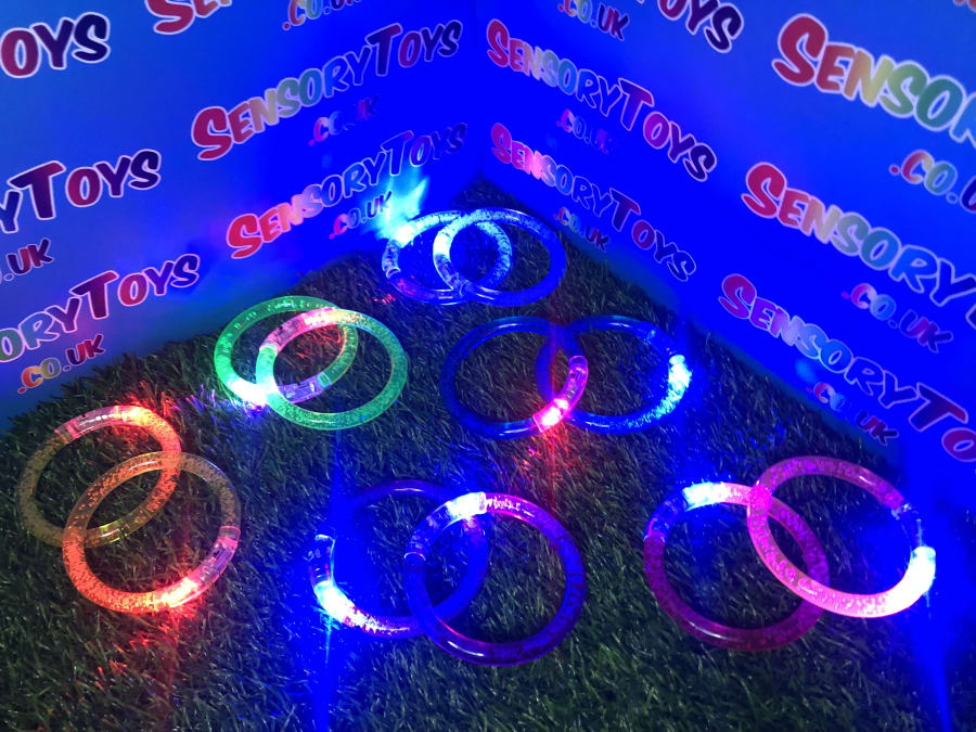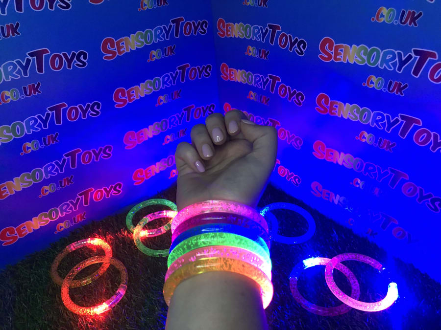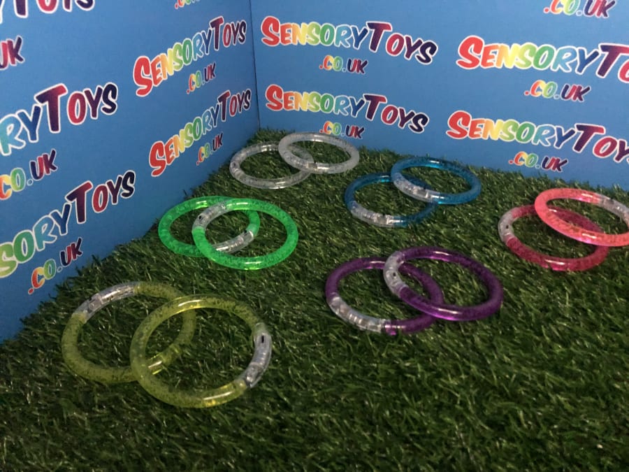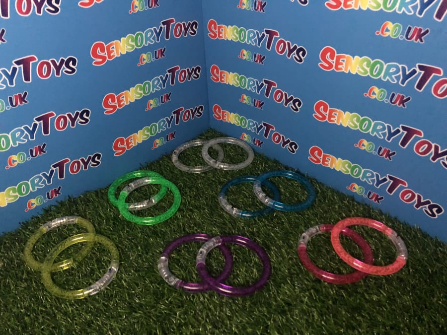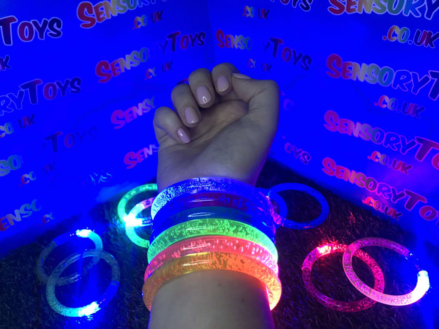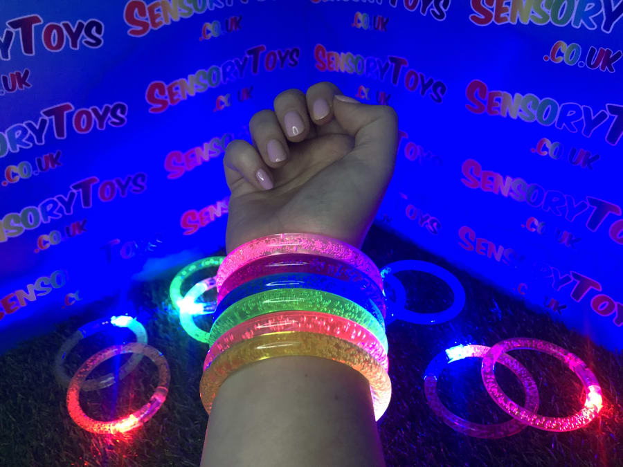 A bright sensory light up Bracelet that glows and fades on your wrist. Available in six different colours, the strong acrylic band has a bubble effect centre that can be seen in our many product photos. One size fits all, recommended for ages 6+ What’s Included? 1 x Light Up Sensory Wristband 1 x Free Batteries Included 1 x Carry Bag 1 x Free Light Up Extra