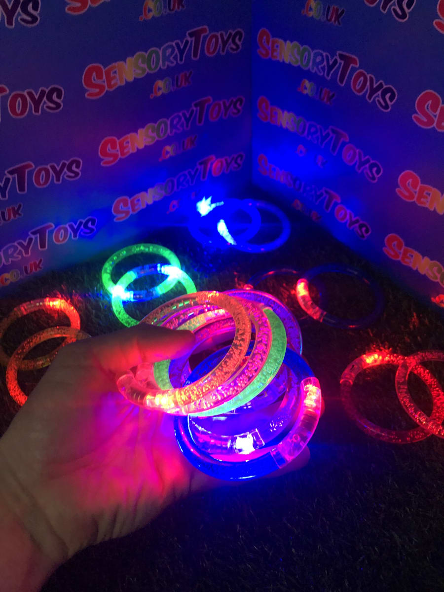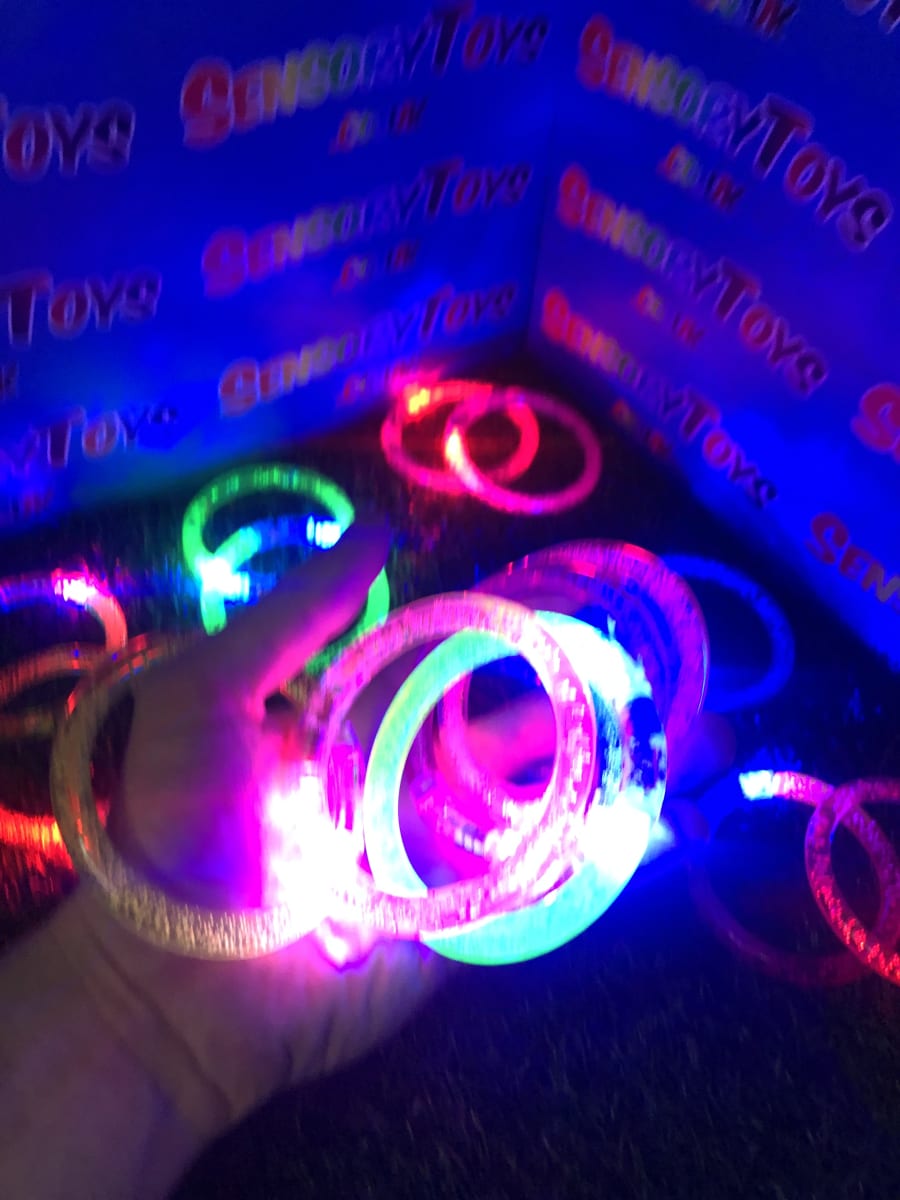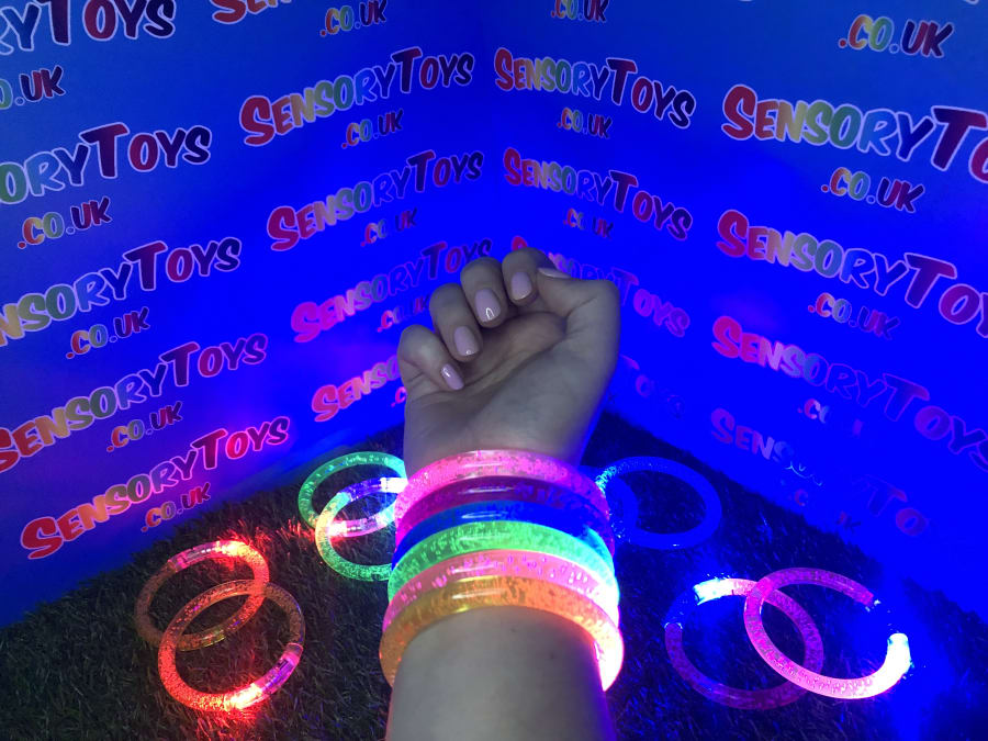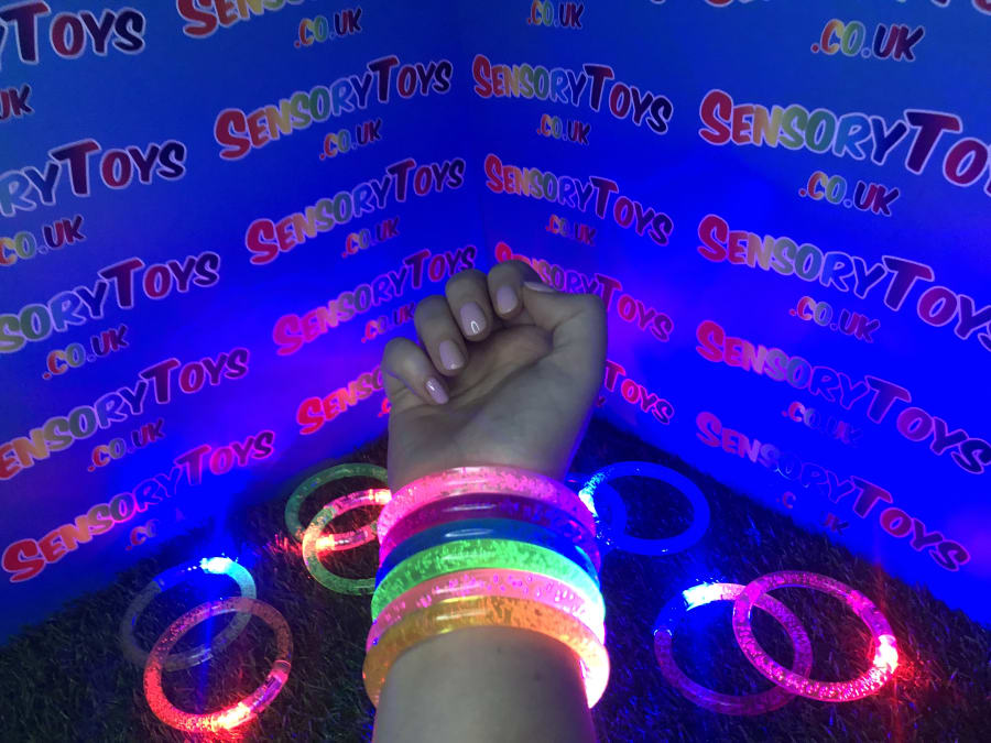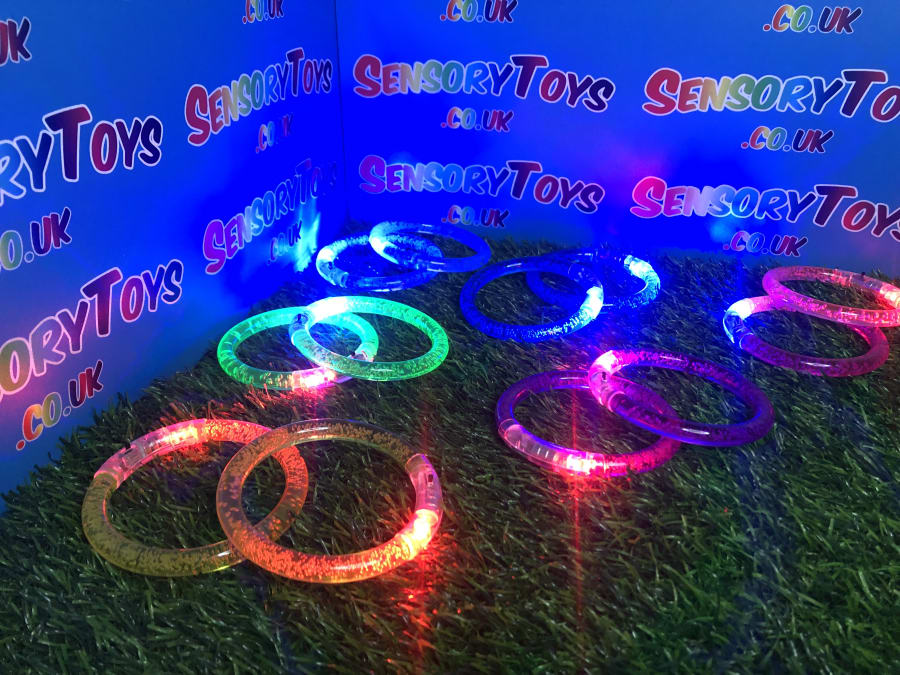 A bright sensory light up Bracelet that glows and fades on your wrist. Available in six different colours, the strong acrylic band has a bubble effect centre that can be seen in our many product photos. One size fits all, recommended for ages 6+ What’s Included? 1 x Light Up Sensory Wristband 1 x Free Batteries Included 1 x Carry Bag 1 x Free Light Up Extra
