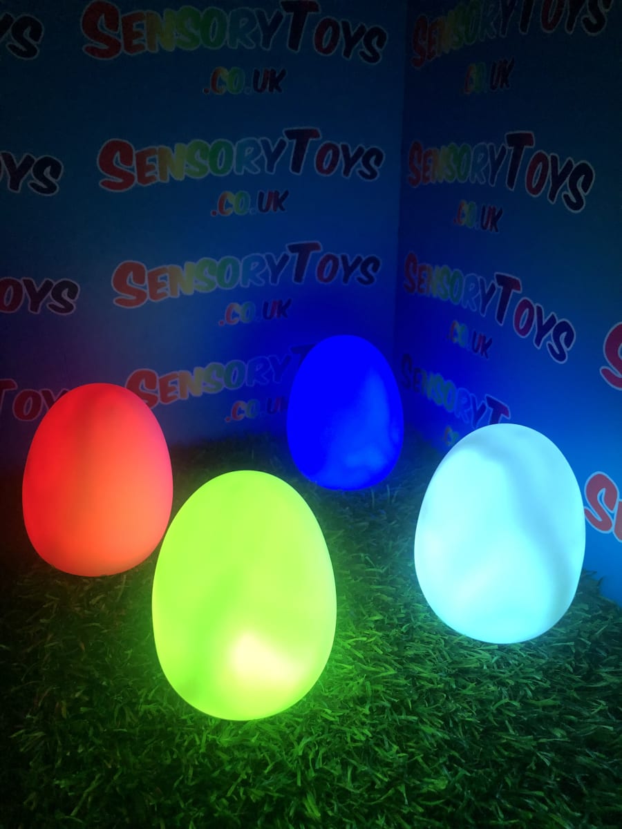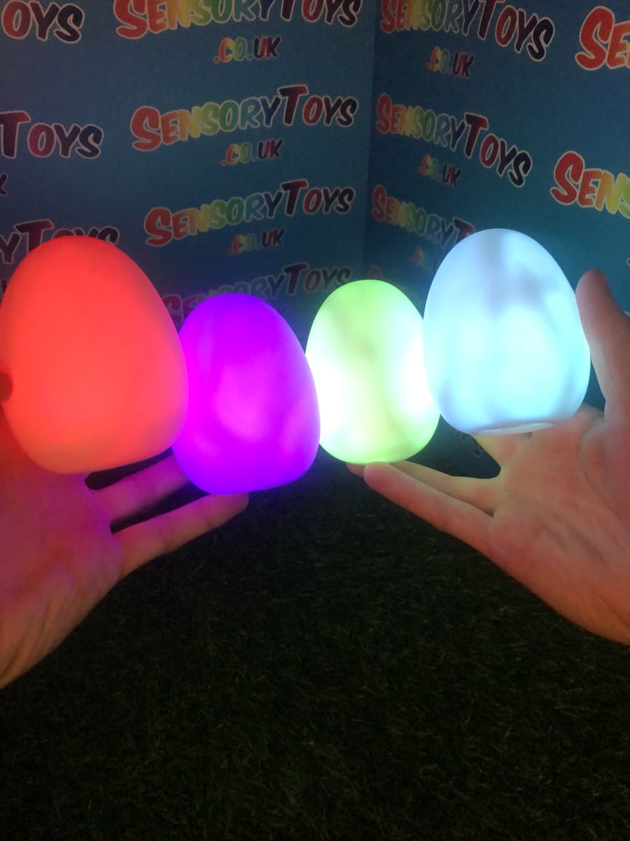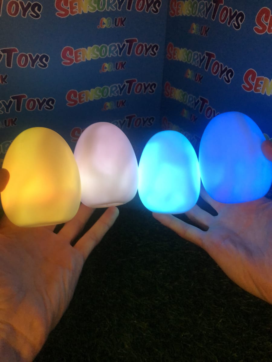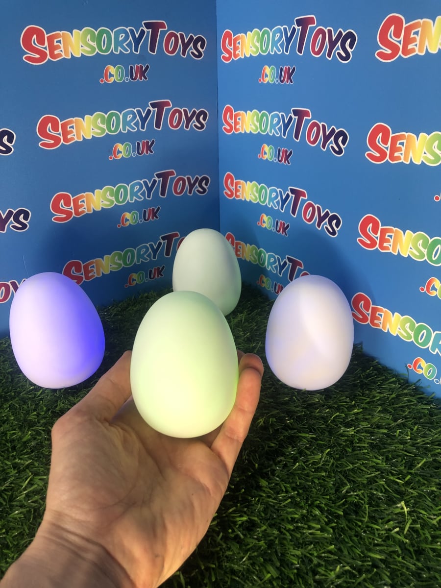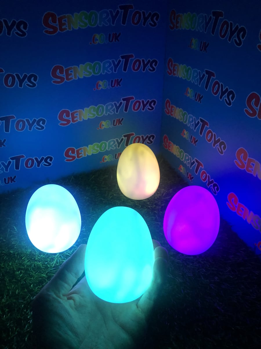 A calming sensory aid egg that fades through colours and helps promote a sense of calm. It’s an extremely robust sensory toy that is battery powered and the perfect size to fit perfectly in the palm of your hand. You can place the egg on a bedroom table to help with the positive night routine or a visual aid as you work at your desk. The Egg itself has a small flat part of the base for easy resting on a flat surface like a table or hand. It’s super bright, made from a durable acrylic and also CE UKCA approved. This egg-shaped wonder fades between bright colours to help users relax and regulate their emotions. It is one of my personal favourite light therapy tools for helping lowering stress and anxiety levels of children and adults. Batteries are included with every sale, so just pull the safety tab and your new sensory egg is ready to use! And with a height of approximately 14cm and a width of 8cm, it’s the perfect size for all your sensory needs. But don’t take our word for it, make sure to check out all the photos and studio video before adding it to your basket. Get cracking and order yours today!
