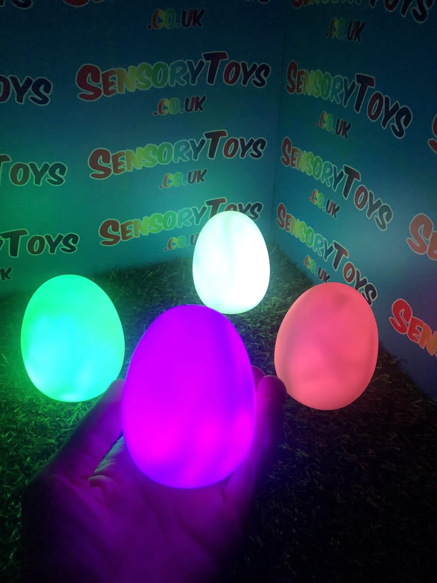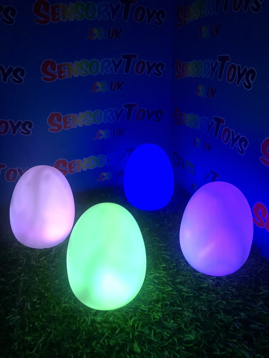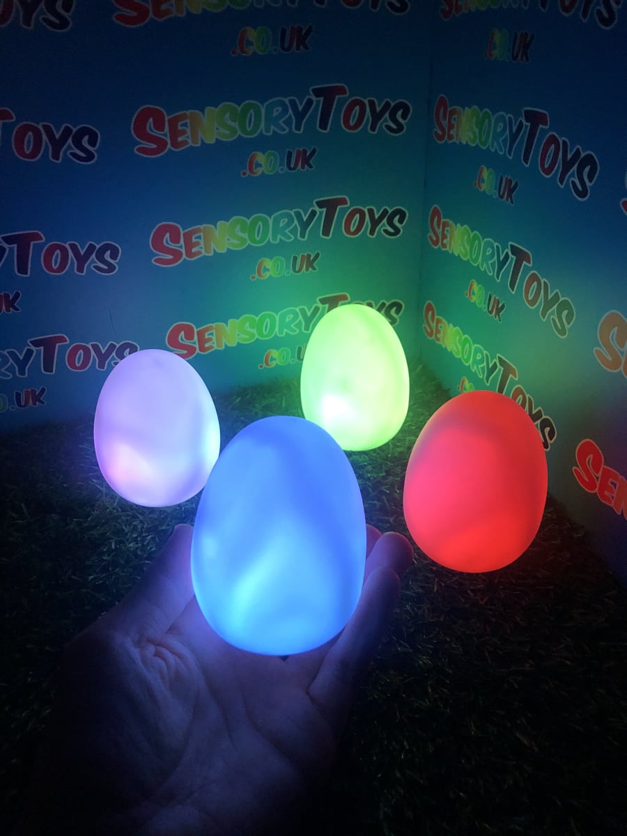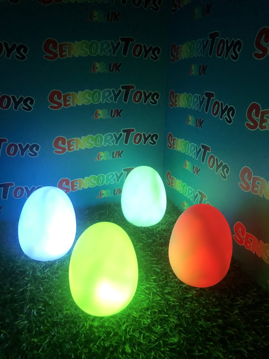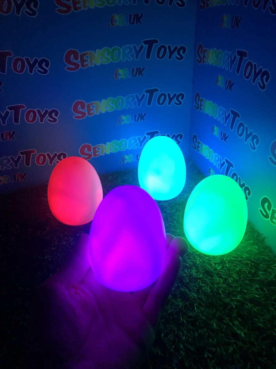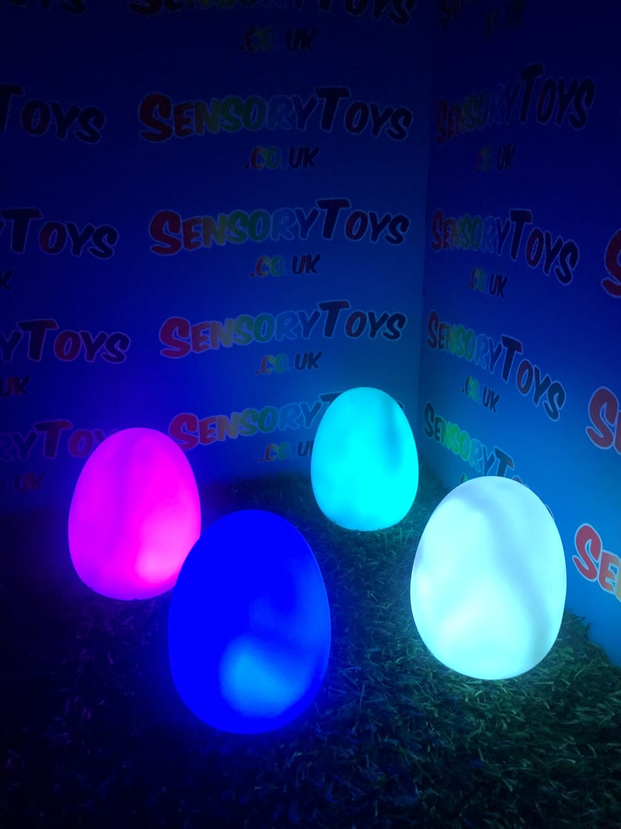 A calming sensory aid egg that fades through colours and helps promote a sense of calm. It’s an extremely robust sensory toy that is battery powered and the perfect size to fit perfectly in the palm of your hand. You can place the egg on a bedroom table to help with the positive night routine or a visual aid as you work at your desk. The Egg itself has a small flat part of the base for easy resting on a flat surface like a table or hand. It’s super bright, made from a durable acrylic and also CE UKCA approved. This egg-shaped wonder fades between bright colours to help users relax and regulate their emotions. It is one of my personal favourite light therapy tools for helping lowering stress and anxiety levels of children and adults. Batteries are included with every sale, so just pull the safety tab and your new sensory egg is ready to use! And with a height of approximately 14cm and a width of 8cm, it’s the perfect size for all your sensory needs. But don’t take our word for it, make sure to check out all the photos and studio video before adding it to your basket. Get cracking and order yours today!