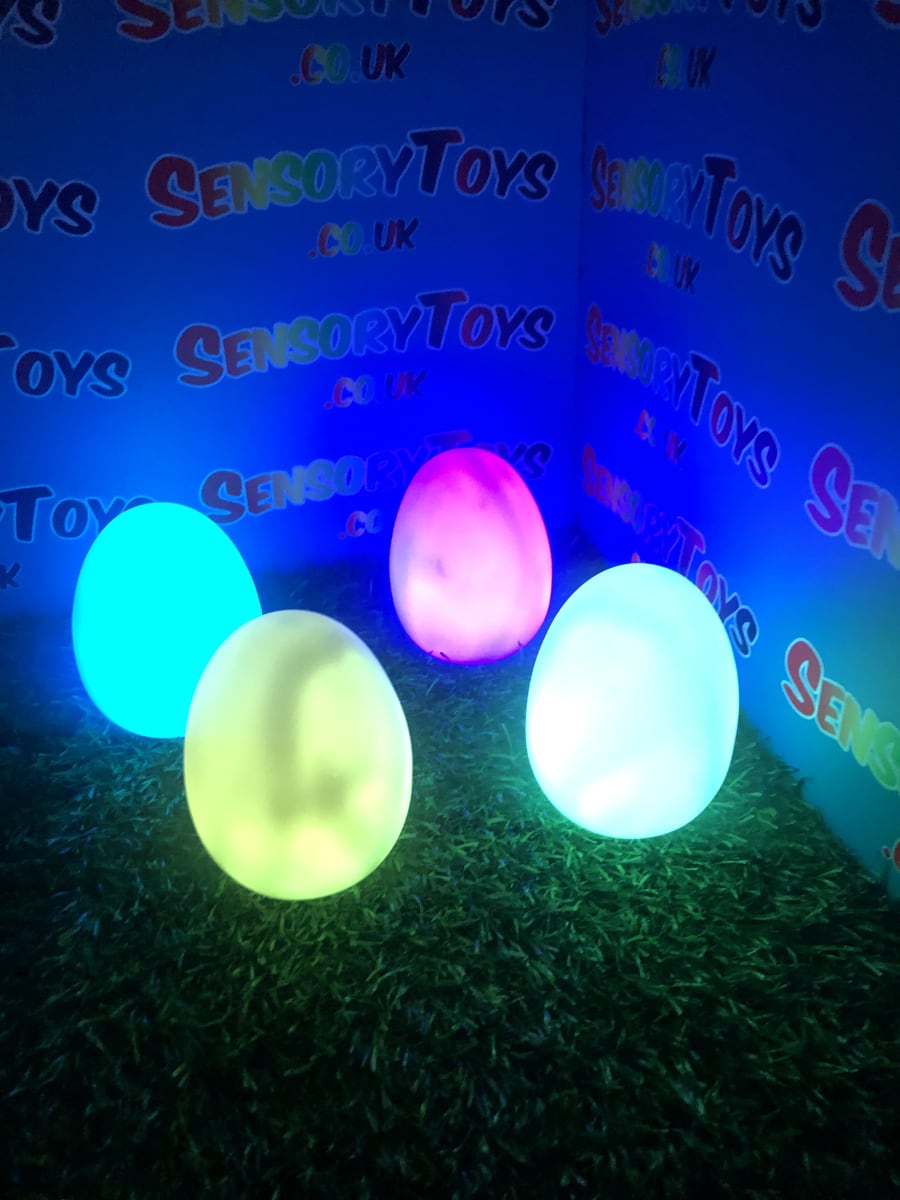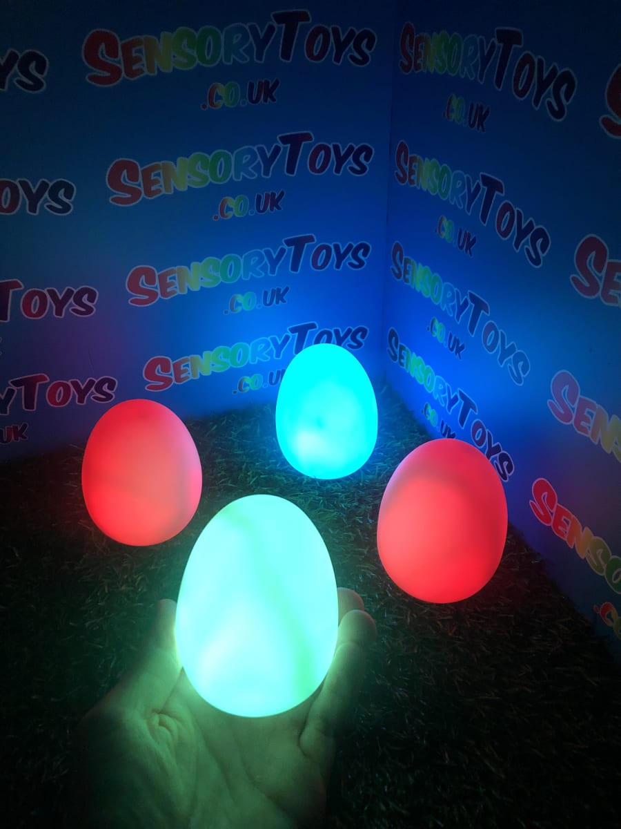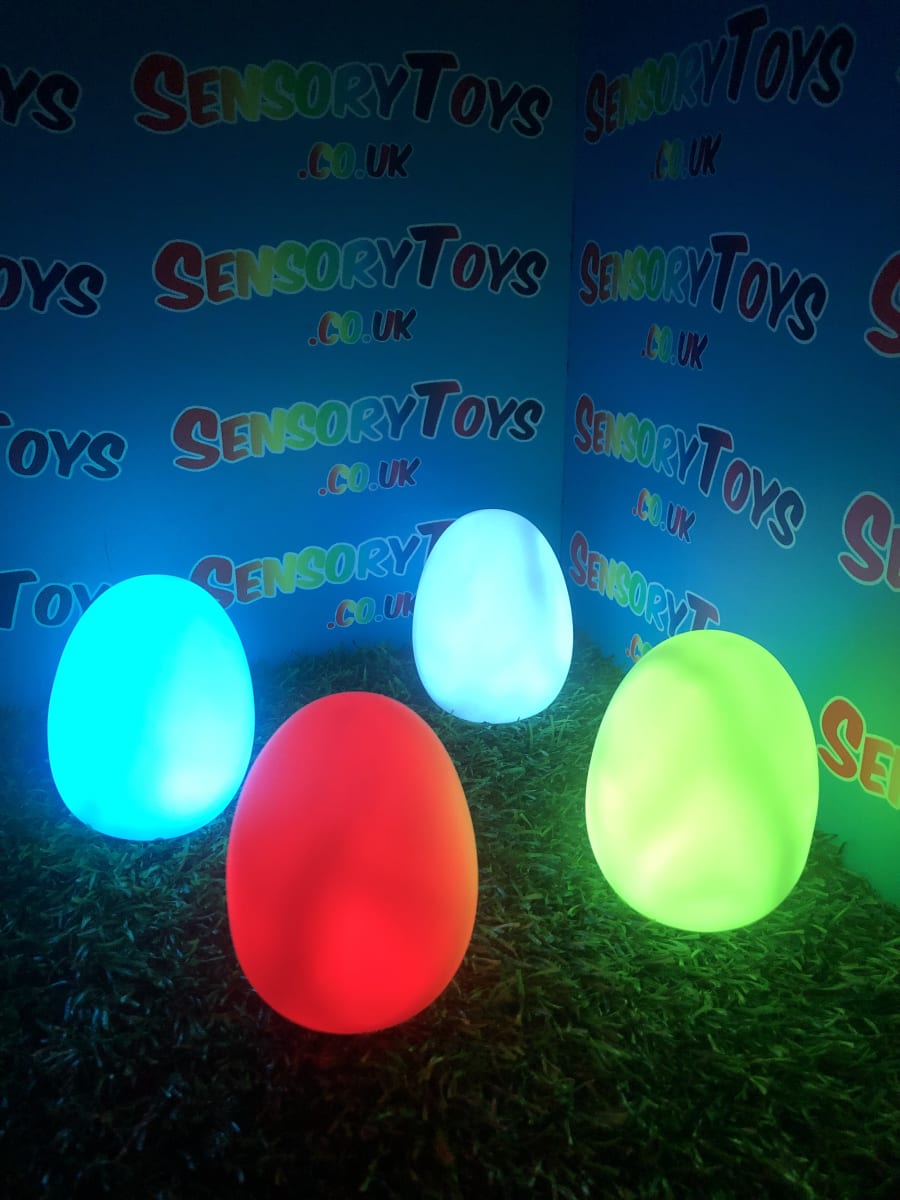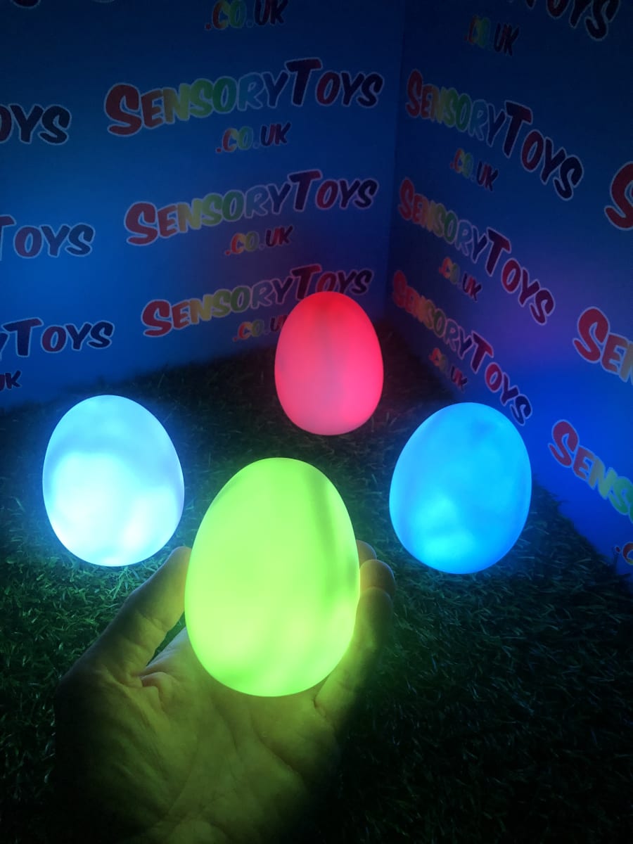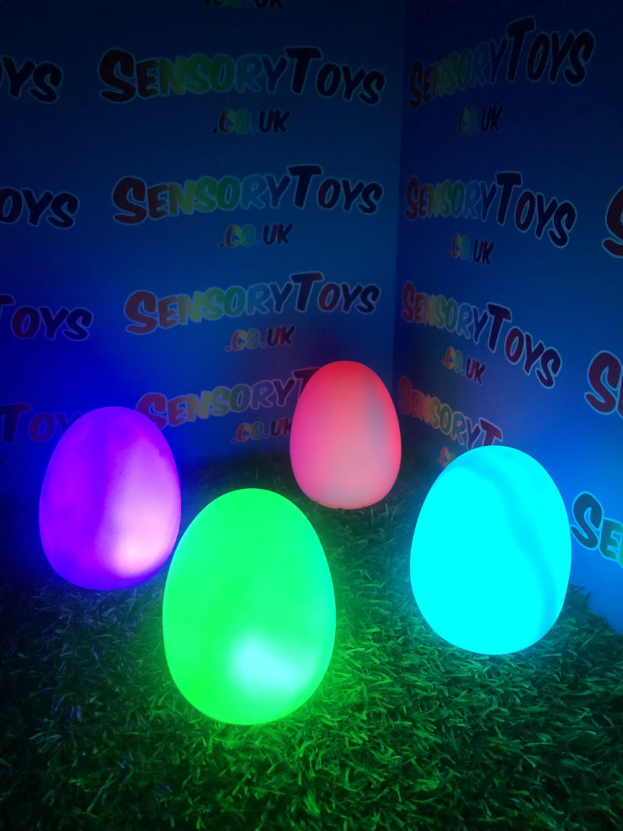 A calming sensory aid egg that fades through colours and helps promote a sense of calm. It’s an extremely robust sensory toy that is battery powered and the perfect size to fit perfectly in the palm of your hand. You can place the egg on a bedroom table to help with the positive night routine or a visual aid as you work at your desk. The Egg itself has a small flat part of the base for easy resting on a flat surface like a table or hand. It’s super bright, made from a durable acrylic and also CE UKCA approved. This egg-shaped wonder fades between bright colours to help users relax and regulate their emotions. It is one of my personal favourite light therapy tools for helping lowering stress and anxiety levels of children and adults. Batteries are included with every sale, so just pull the safety tab and your new sensory egg is ready to use! And with a height of approximately 14cm and a width of 8cm, it’s the perfect size for all your sensory needs. But don’t take our word for it, make sure to check out all the photos and studio video before adding it to your basket. Get cracking and order yours today!