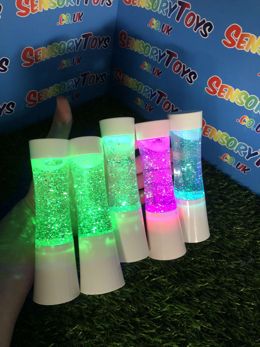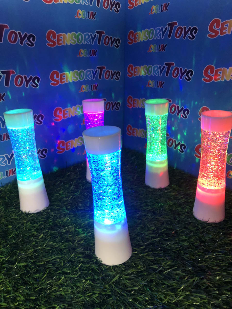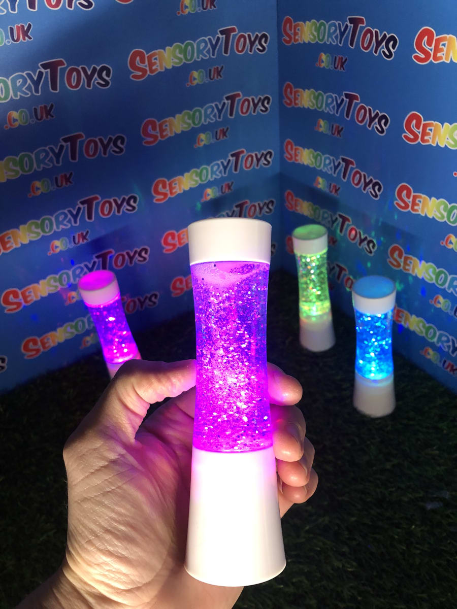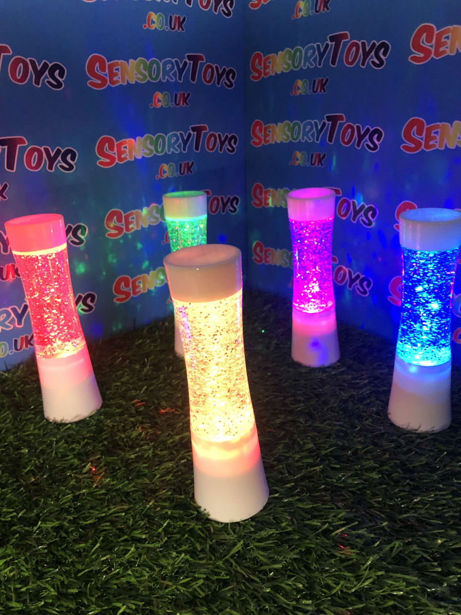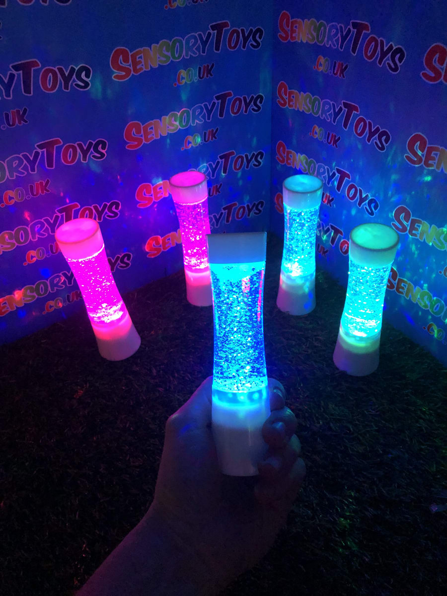 A beautiful handheld light up glitter lamp that’s perfect for on the go fun! Battery powered so no wires, simply shake the lamp to create a colour changing light the reflects on the glitter inside. This creates a beautiful projection too on any nearby walls. Sensory lights are a fantastic educational learning aid, which is also proven to help lower stress and anxiety. Children and adults can retain and learn information more effectively when in a calming, play based environment. You can see this best below in our sensory studio video below!