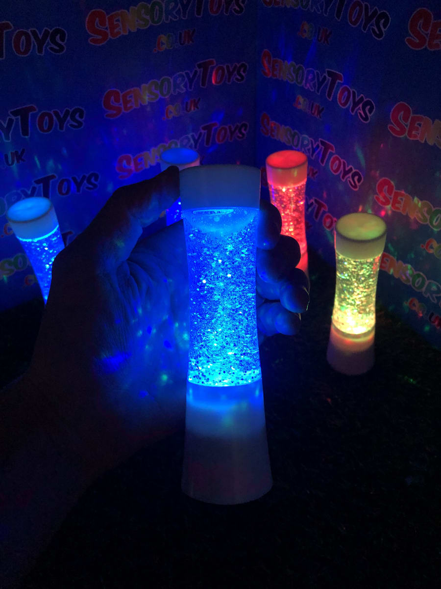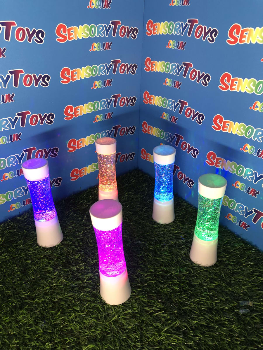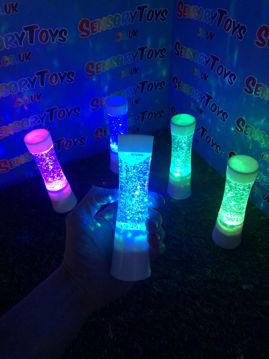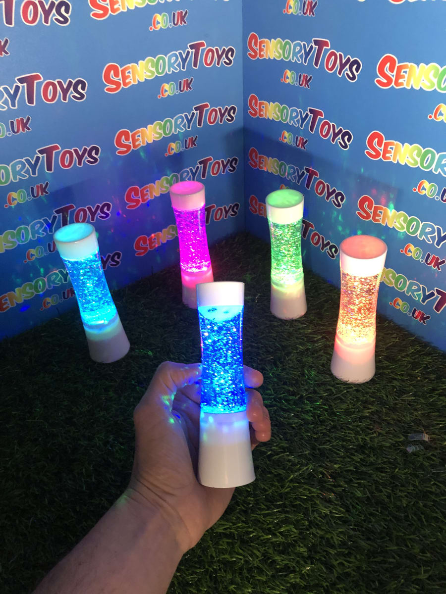 A beautiful handheld light up glitter lamp that’s perfect for on the go fun! Battery powered so no wires, simply shake the lamp to create a colour changing light the reflects on the glitter inside. This creates a beautiful projection too on any nearby walls. Sensory lights are a fantastic educational learning aid, which is also proven to help lower stress and anxiety. Children and adults can retain and learn information more effectively when in a calming, play based environment. You can see this best below in our sensory studio video below!