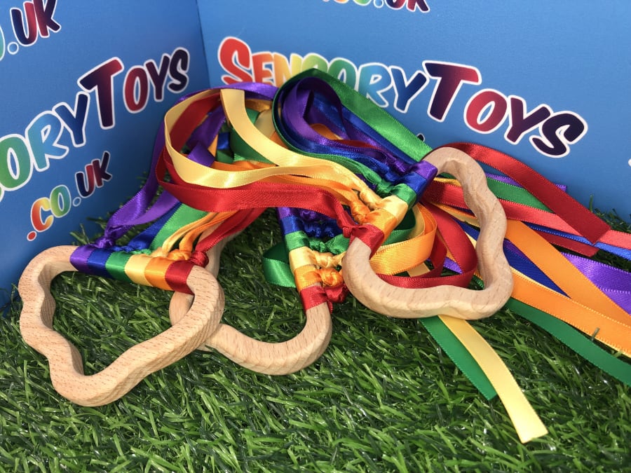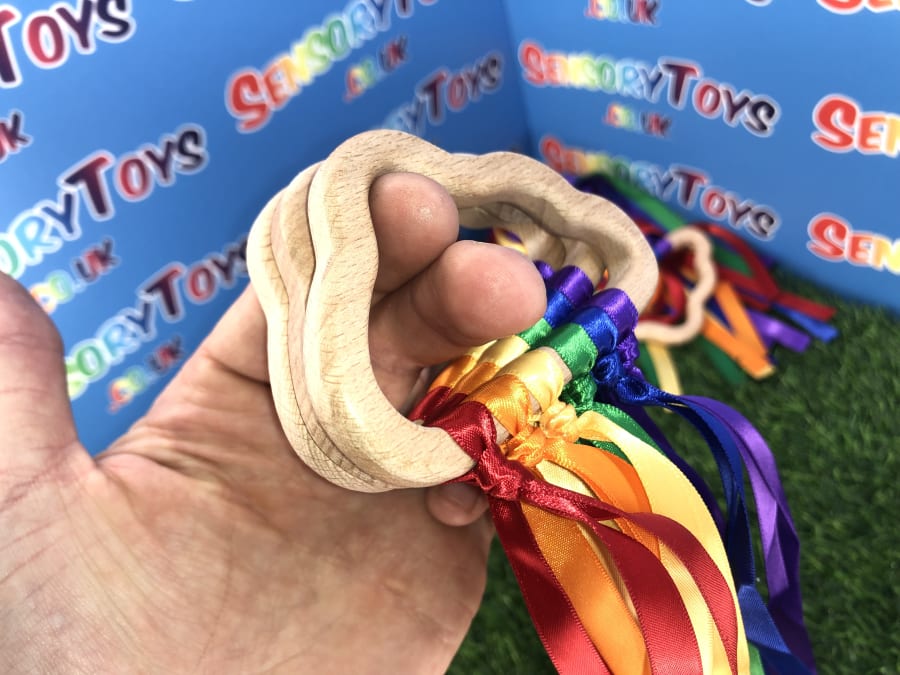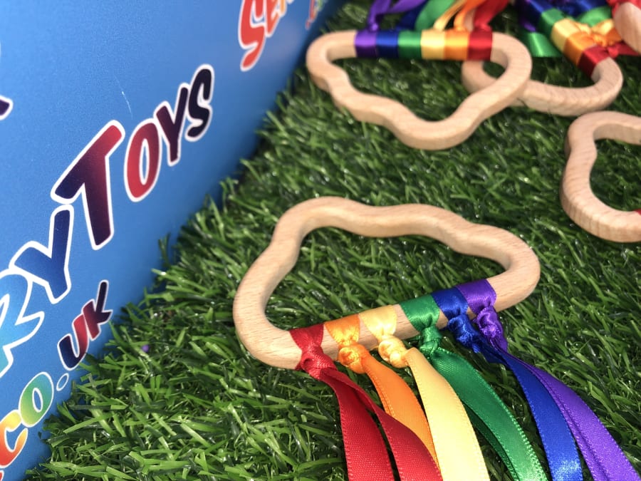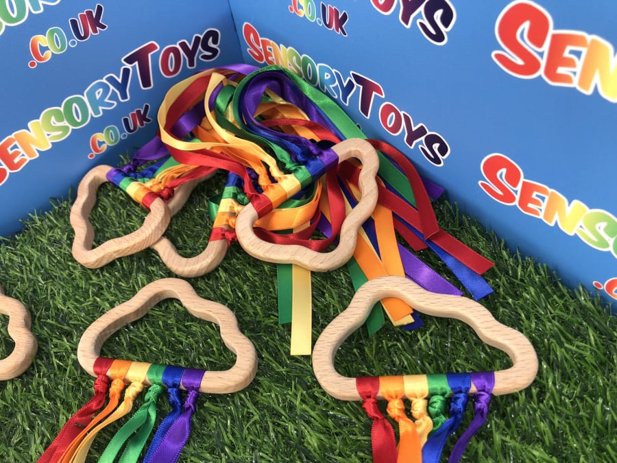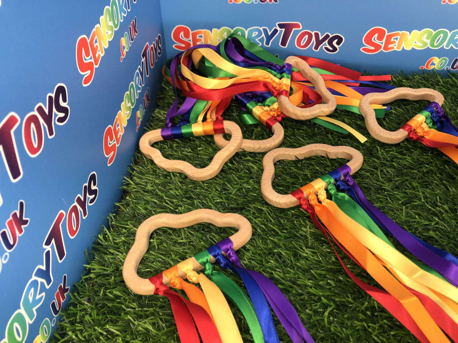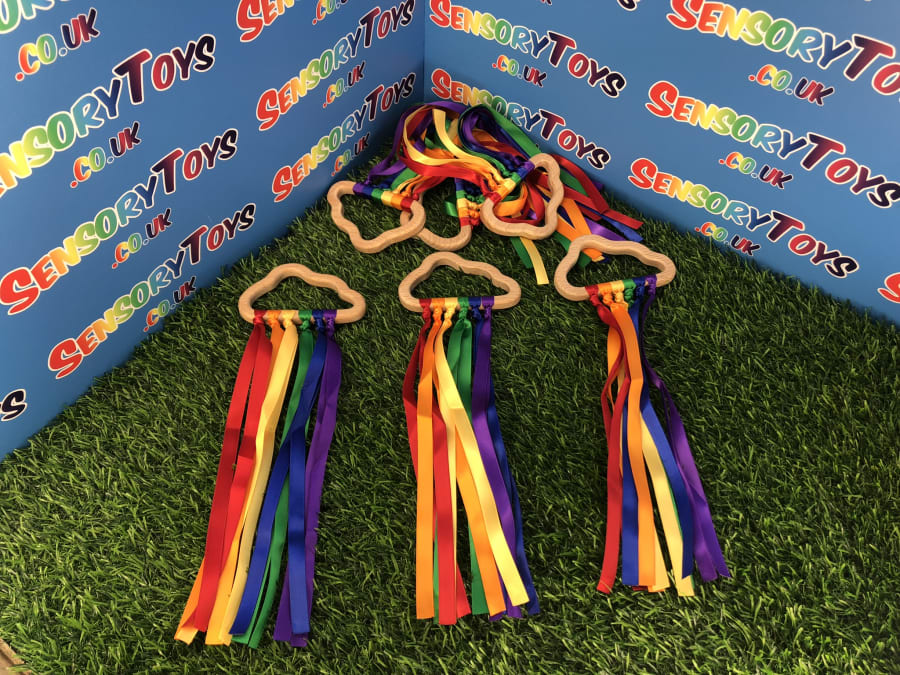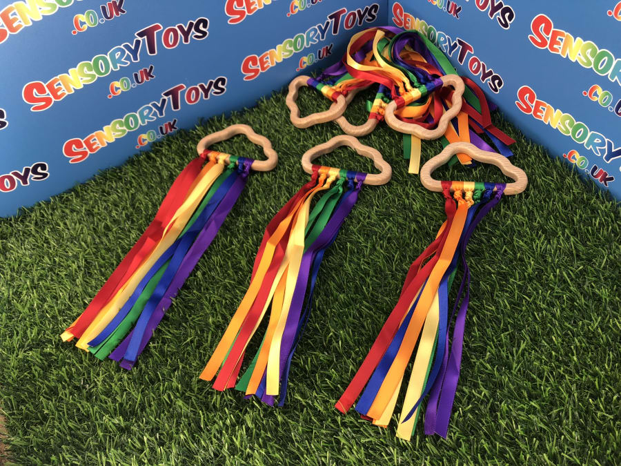 Beautifully designed and popular for newborns, our hand made custom wooden cloud has ten rainbow cotton ribbons on a wooden finish ring. Made with brightly coloured grosgrain ribbon, it's perfect to capture a baby's attention. The ribbons provide ideal sensory stimulation with a tactile texture and an interesting sound when shaken around. The ring measures approximately 11cm x 6cm, and the ribbons are 29cm long. Each product is lovingly handmade by the team at Sensory toys and slight product measurements vary.