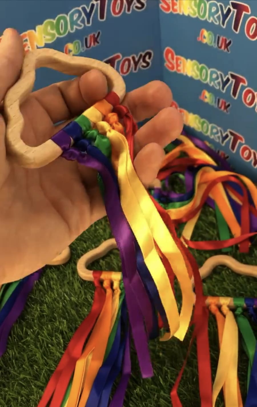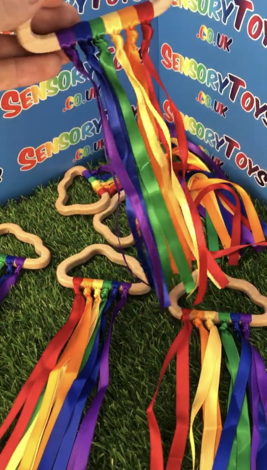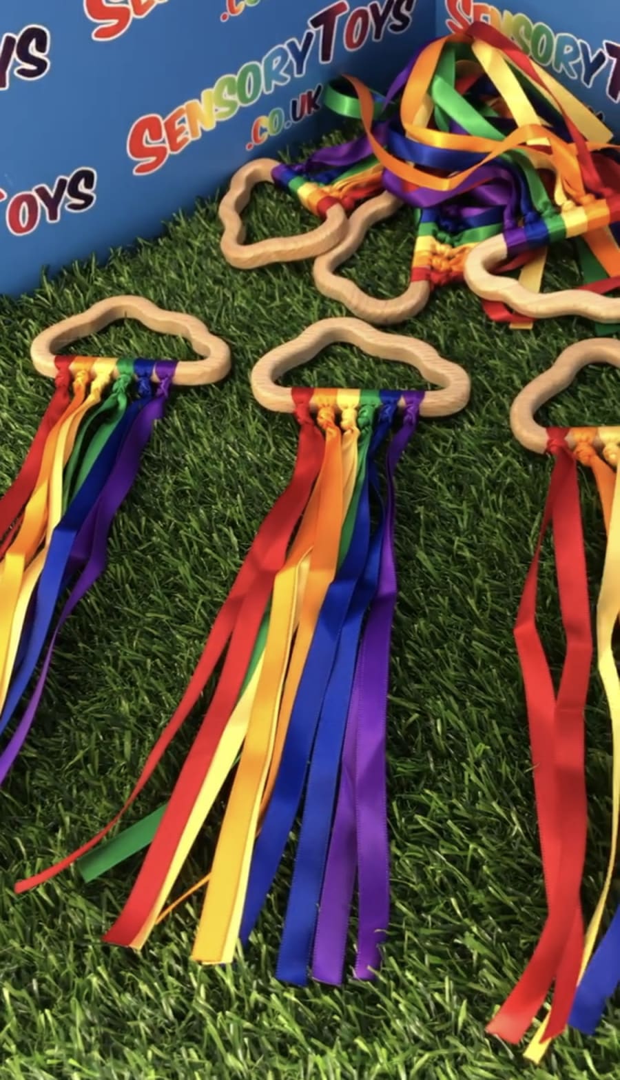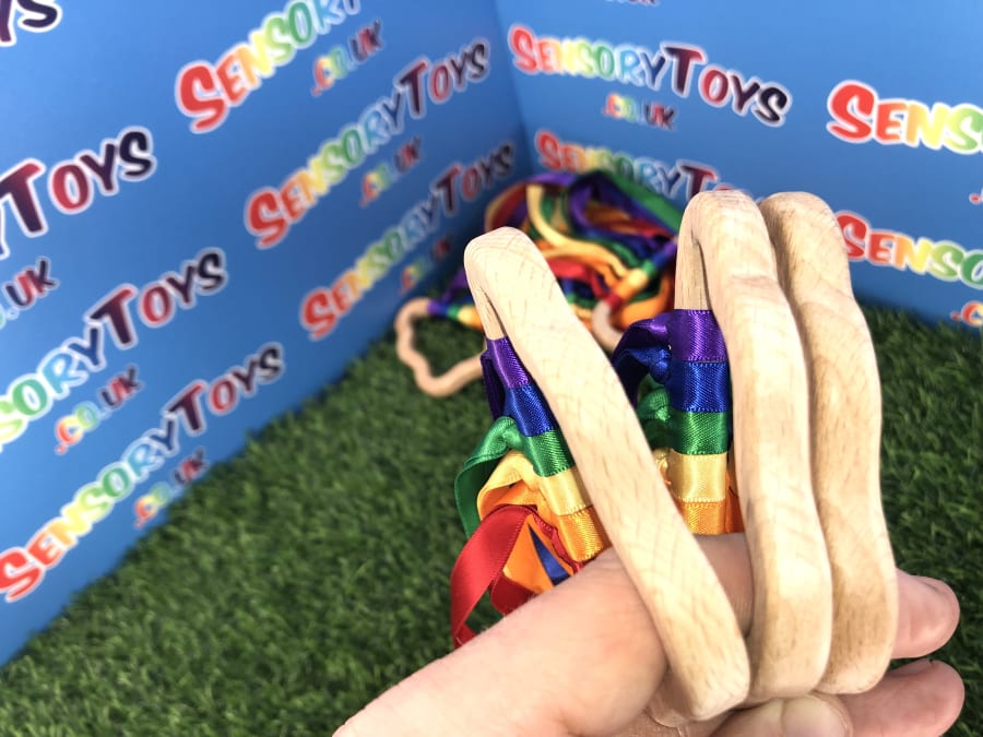 Beautifully designed and popular for newborns, our hand made custom wooden cloud has ten rainbow cotton ribbons on a wooden finish ring. Made with brightly coloured grosgrain ribbon, it's perfect to capture a baby's attention. The ribbons provide ideal sensory stimulation with a tactile texture and an interesting sound when shaken around. The ring measures approximately 11cm x 6cm, and the ribbons are 29cm long. Each product is lovingly handmade by the team at Sensory toys and slight product measurements vary.