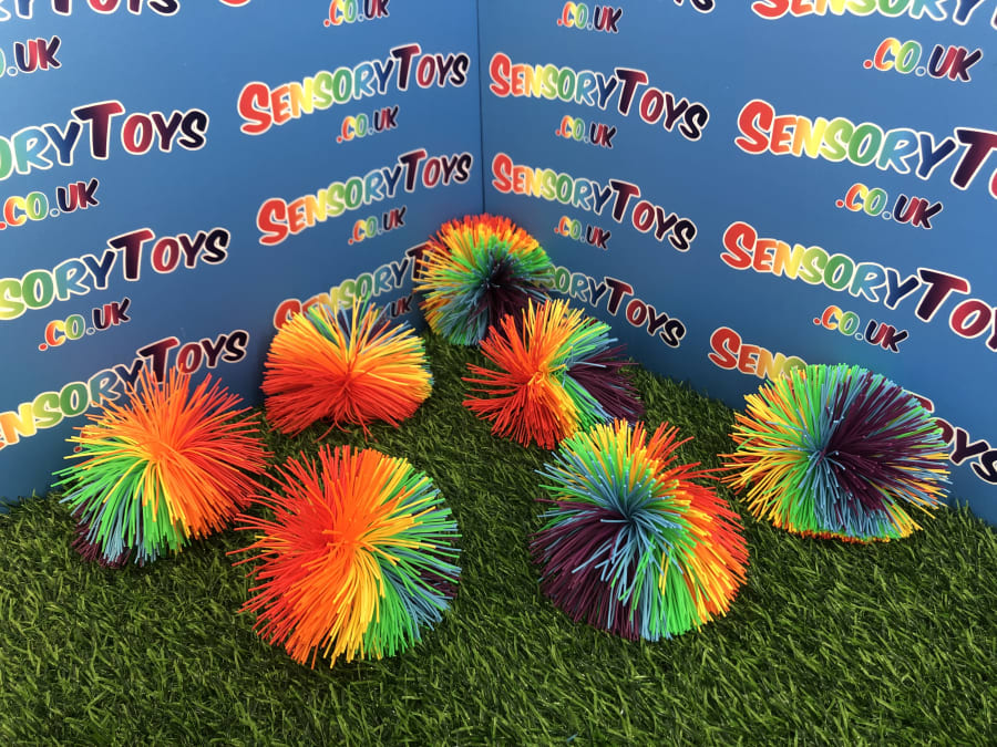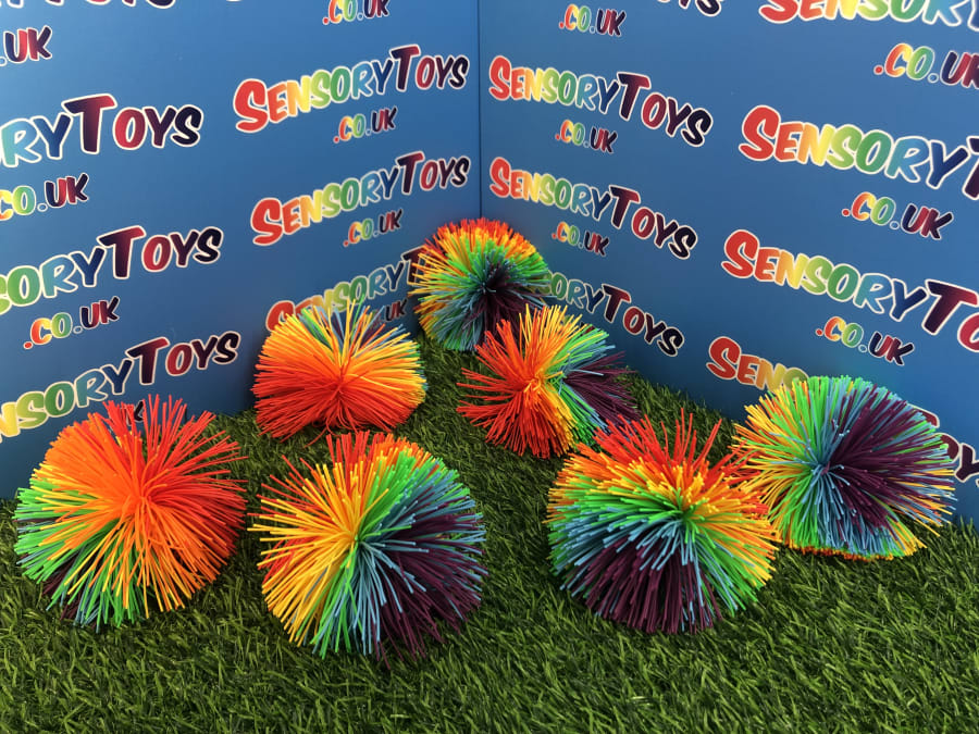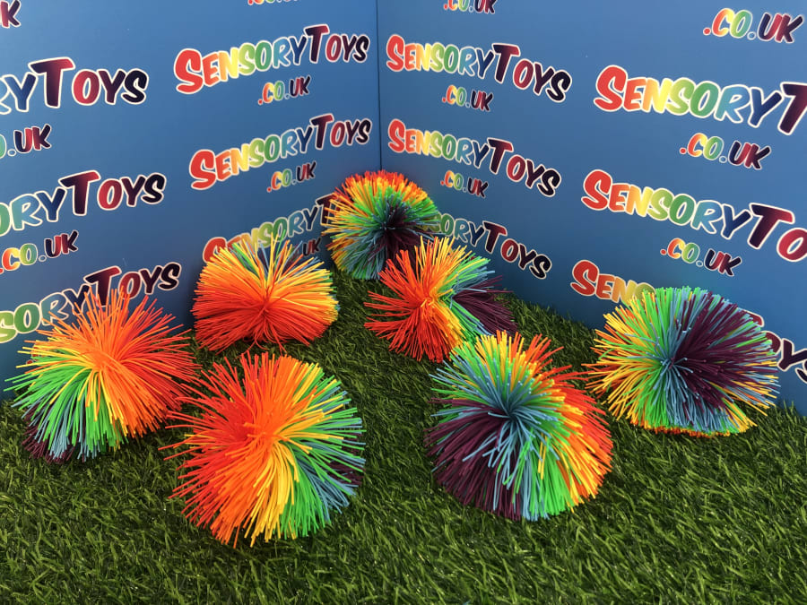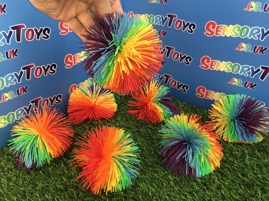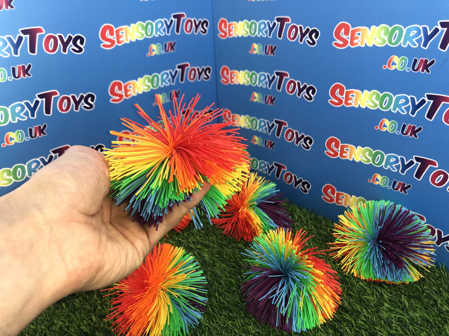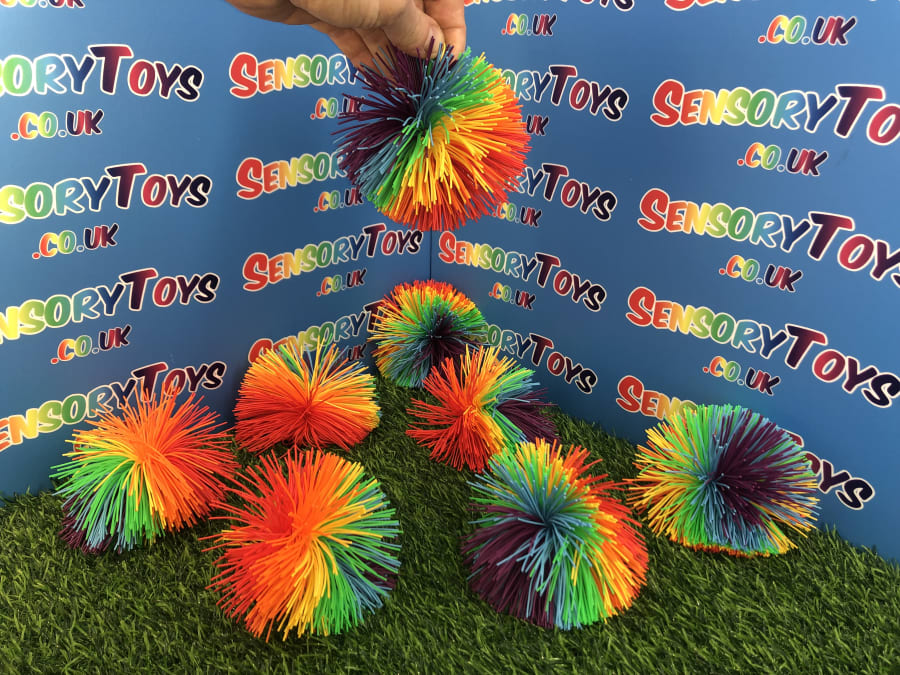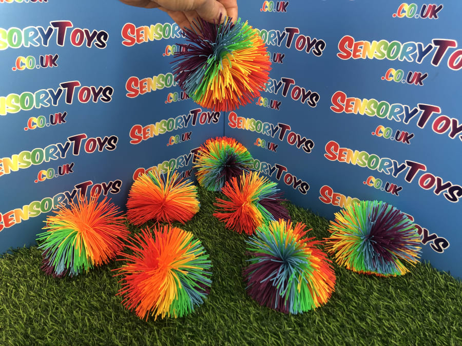 Rainbow String Balls are a cluster of tactile colorful strings that is very therapeutic to touch. Also known as monkey string balls, these are popular with helping with stress reduction as well as sensory play scenarios like learning in the classroom and within therapy sessions. The bright vibrant colours are very eye catching and the overall large size of the ball at 10cm diameter, makes the strings overflow and burst from your hand!
